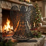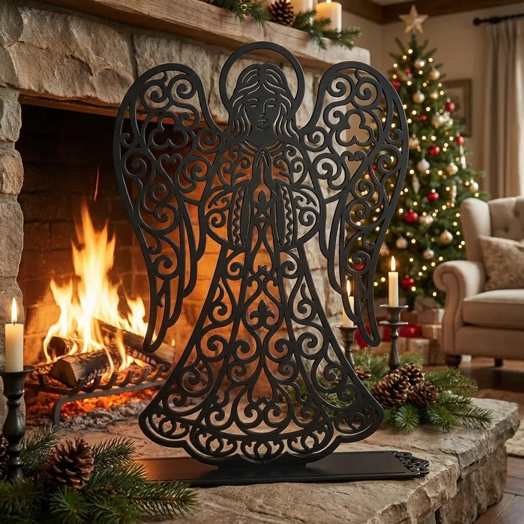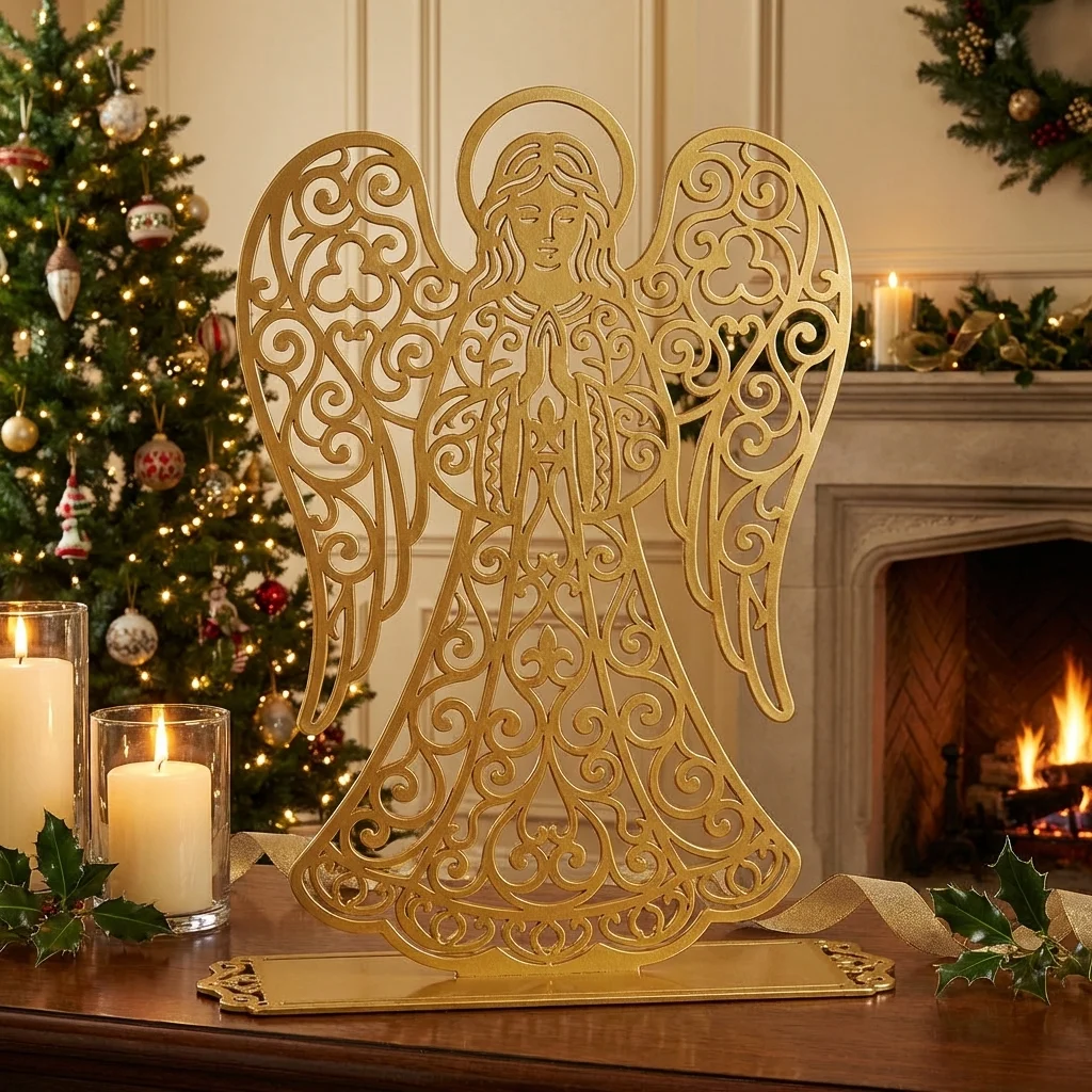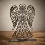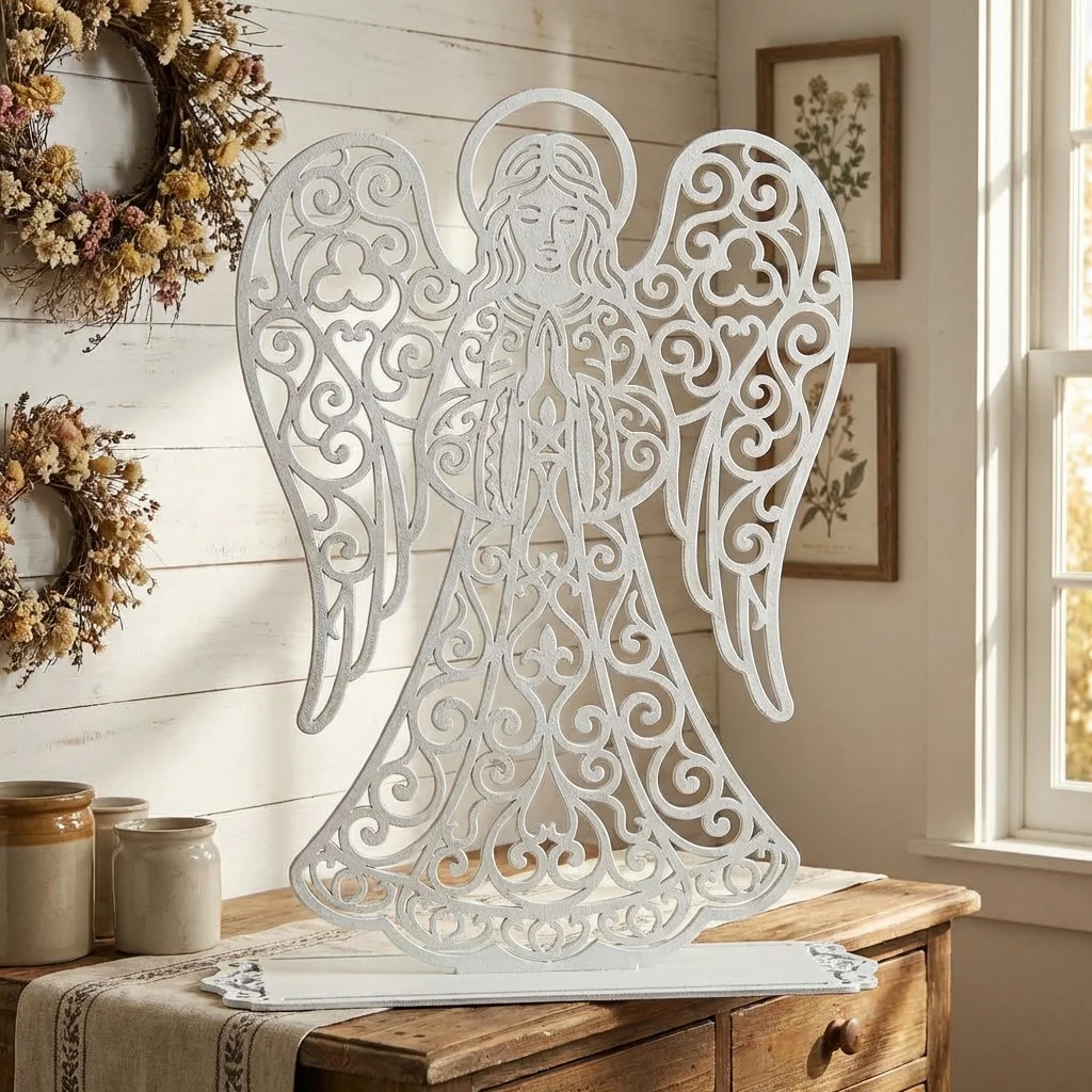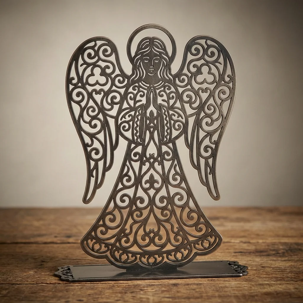Anioł Modlitwy Królewski – metalowa dekoracja wolnostojąca to elegancka ozdoba sakralna o dostojnym i reprezentacyjnym charakterze. Bogato zdobiony, ażurowy wzór oraz spokojna postać anioła w modlitewnej pozie sprawiają, że dekoracja pięknie prezentuje się na komodzie, półce, konsoli lub w domowym kąciku modlitwy.