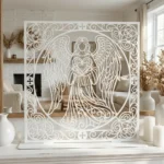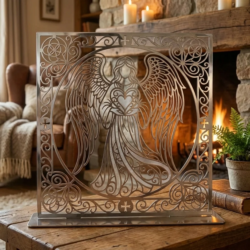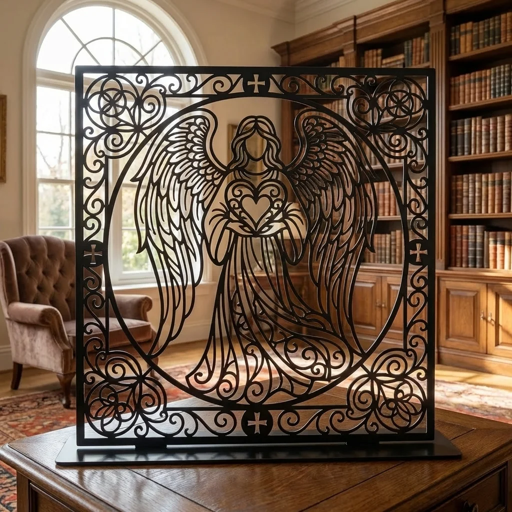 Anioł Serca Gloria – metalowa dekoracja wolnostojąca to elegancka ozdoba sakralna o reprezentacyjnym i dekoracyjnym charakterze. Centralny motyw anioła trzymającego serce został połączony z bogatą, ażurową oprawą, dzięki czemu dekoracja pięknie prezentuje się na komodzie, półce, konsoli lub w domowym kąciku modlitwy.