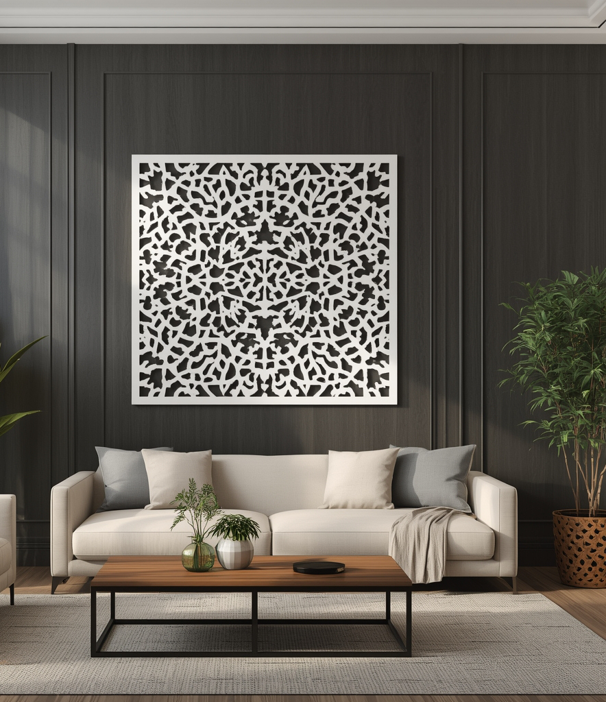 Ażurowy panel dekoracyjny o symetrycznym orientalnym wzorze, idealny jako ozdoba wnętrza lub fasady.
