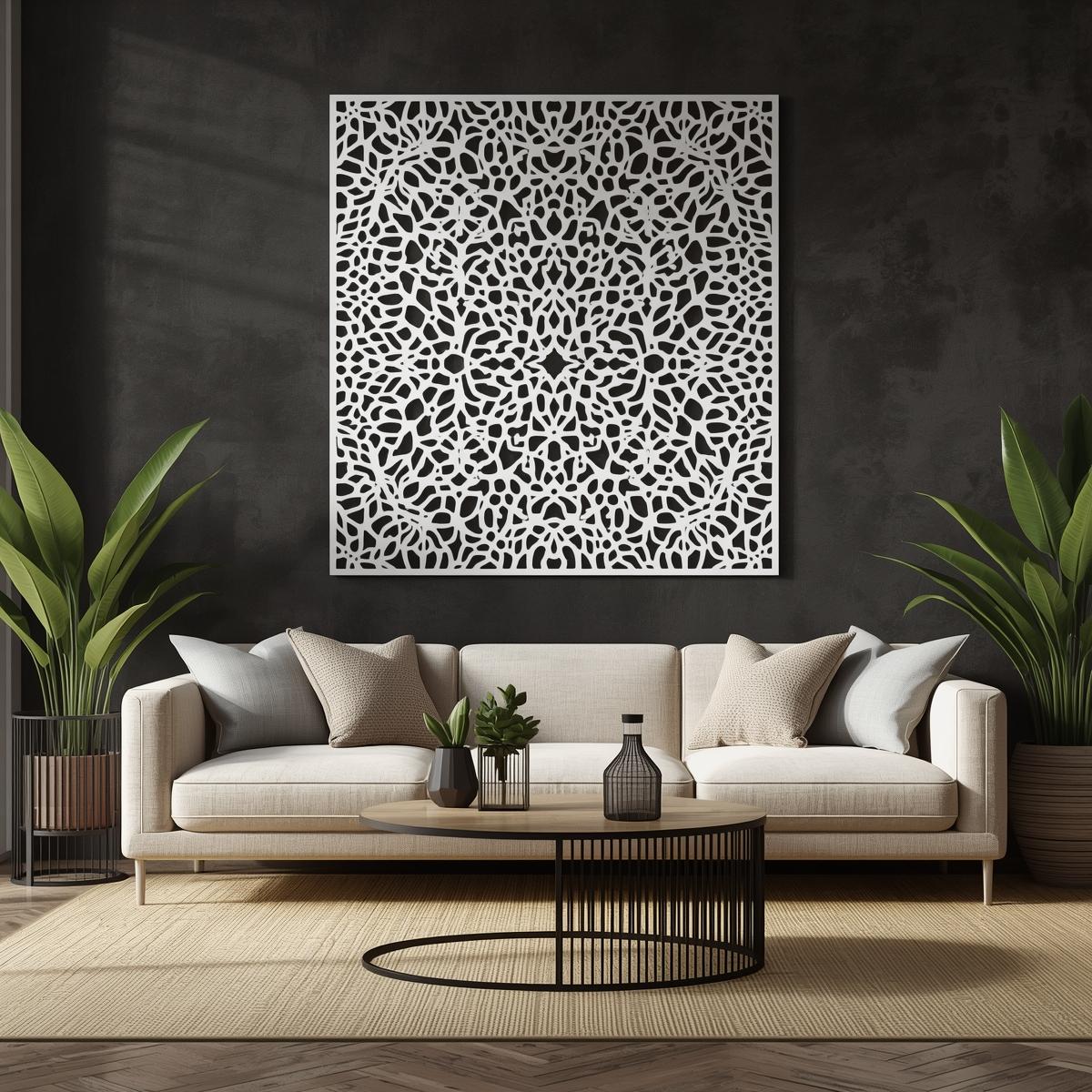 Panel dekoracyjny "Ażurowa Koronka" wycinany laserowo z metalu. Idealny do wnętrz i ogrodów, tworzy efektowną ozdobę ściany lub ogrodzenia.