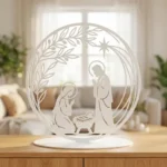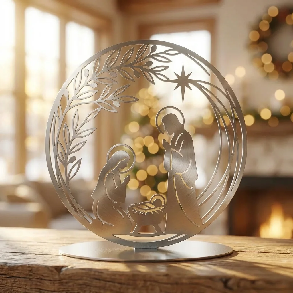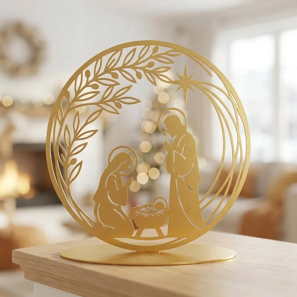 Betlejemska Noc – metalowa dekoracja wolnostojąca to wyjątkowa ozdoba sakralna inspirowana sceną narodzenia. Motyw Maryi, Józefa i Dzieciątka pod gwiazdą betlejemską został zamknięty w harmonijnej, okrągłej kompozycji, dzięki czemu dekoracja pięknie prezentuje się na komodzie, półce, konsoli lub świątecznym stole.