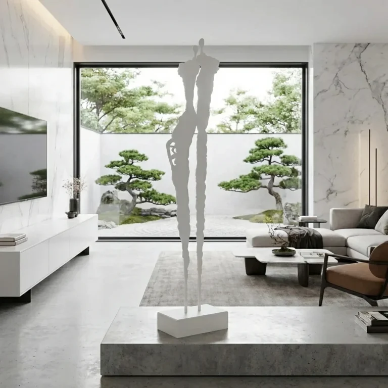 Bliskość to wolnostojąca rzeźba ogrodowa z metalu przedstawiająca dwie smukłe sylwetki w geście harmonii i relacji. Idealna do nowoczesnych ogrodów, na taras i do strefy wejściowej jako elegancki, artystyczny akcent. Rozmiary: 5×25 cm, 7×35 cm, 9×45 cm. Warianty: corten, czarny, biały, złoty lub stal nierdzewna szczotkowana. Darmowa dostawa na terenie Polski.
