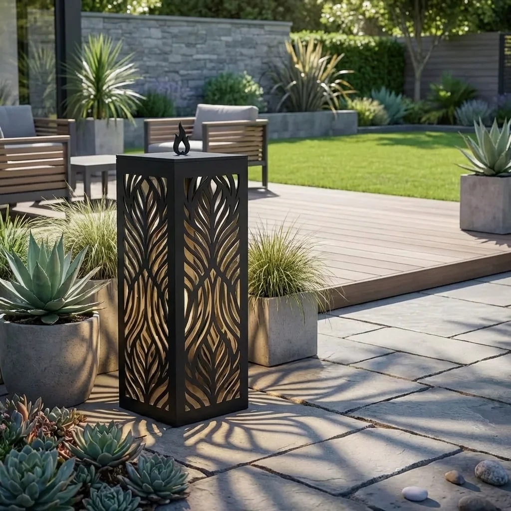 Lampion może zostać wykonany w różnych wariantach wykończenia, takich jak corten (rdzawy), czarny, biały, złoty oraz stal szczotkowana. Pozwala to dopasować produkt do stylu otoczenia – od naturalnego i rustykalnego, po nowoczesny i premium.
