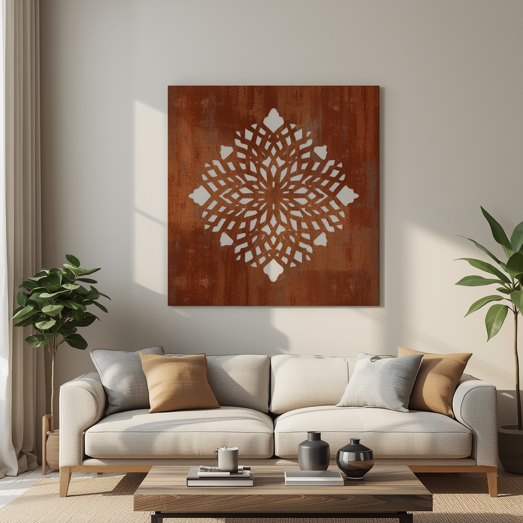 Panel dekoracyjny „Cortenowa Gwiazda” to nowoczesna propozycja w industrialnym stylu. Symetryczny wzór przypominający gwiazdę został precyzyjnie wycięty laserowo w metalu, a wykończenie corten nadaje mu wyjątkowego charakteru i naturalnej elegancji.