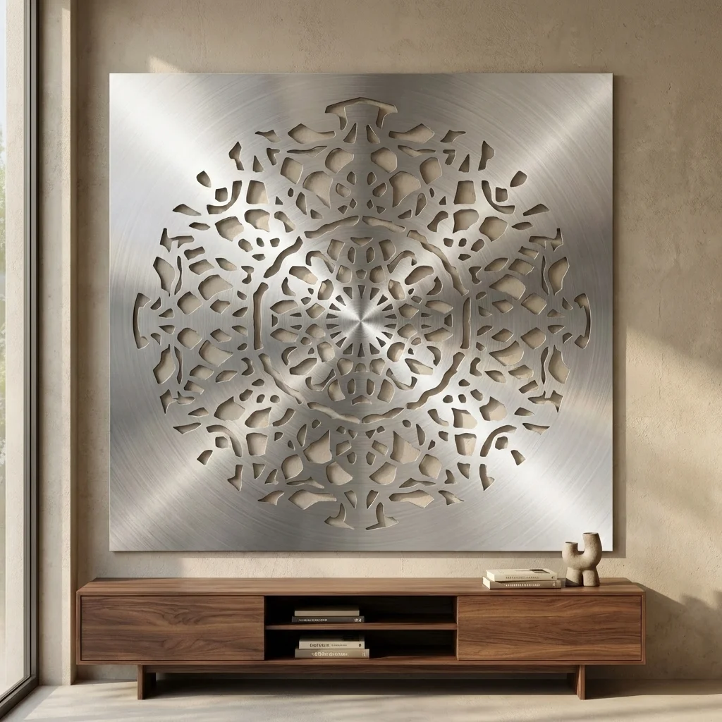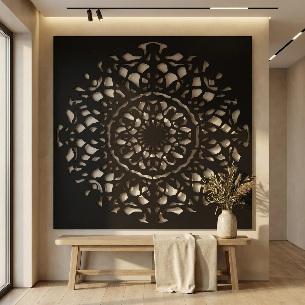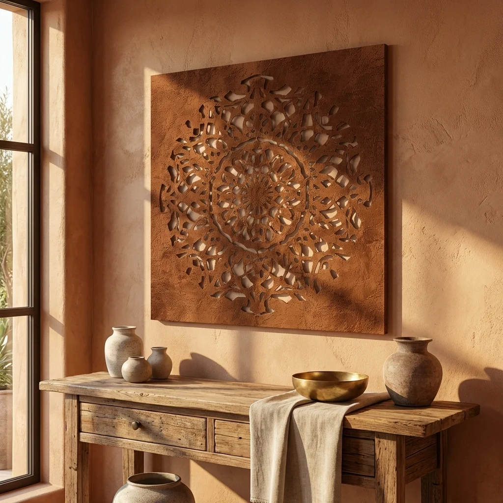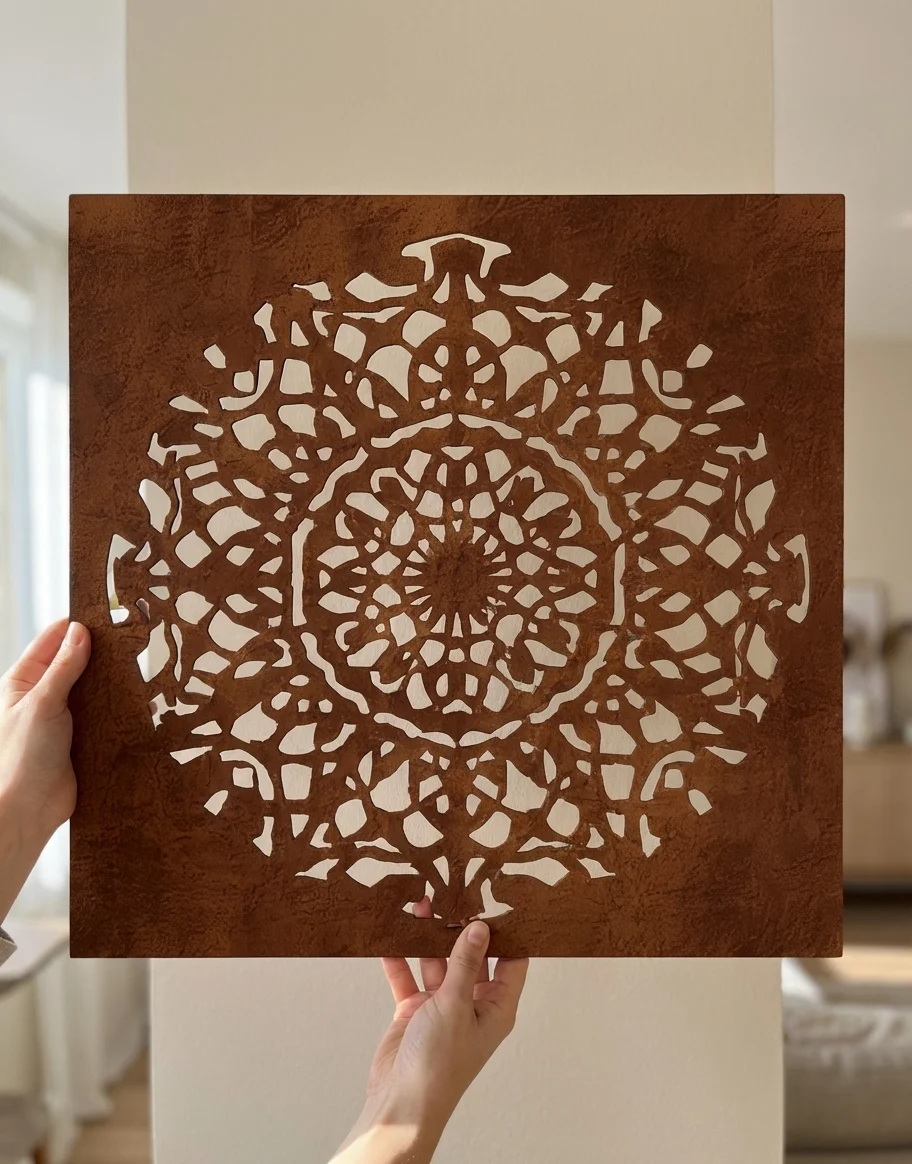 Cortenowa Rozeta to metalowa dekoracja ścienna o wyrazistym, symetrycznym wzorze inspirowanym rozetą i ornamentem dekoracyjnym. Jej ażurowa forma przyciąga uwagę, dodaje wnętrzu głębi i tworzy elegancki akcent na ścianie w salonie, holu, gabinecie, restauracji lub przestrzeni komercyjnej.