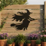 Metalowa dekoracja ścienna przedstawiająca czarownicę lecącą na miotle – klasyczny motyw Halloween.