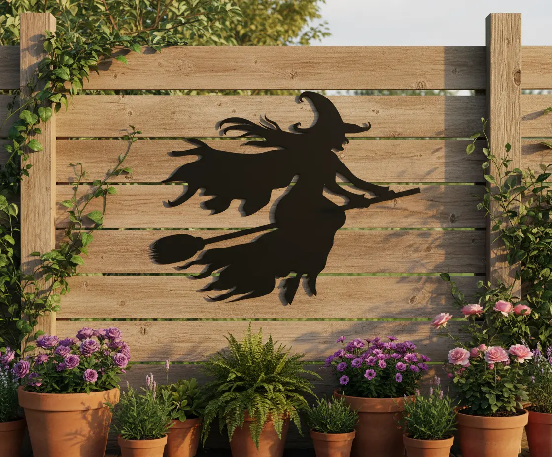 Ta metalowa dekoracja „Czarownica w Locie na Miotle” to idealny wybór, aby dodać wnętrzu lub ogrodowi klimatu Halloween. Dynamiczny kształt czarownicy z rozwianą peleryną przyciąga wzrok i wprowadza mroczny nastrój. Wykonana z trwałej stali, malowana proszkowo, nadaje się do powieszenia w domu, na tarasie czy przy wejściu.