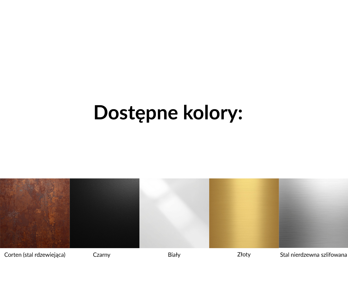 | Kolor | Corten (stal rdzawa), Stal malowana proszkowo – biała, Stal malowana proszkowo – czarna, Stal malowana proszkowo – złota, Stal nierdzewna |