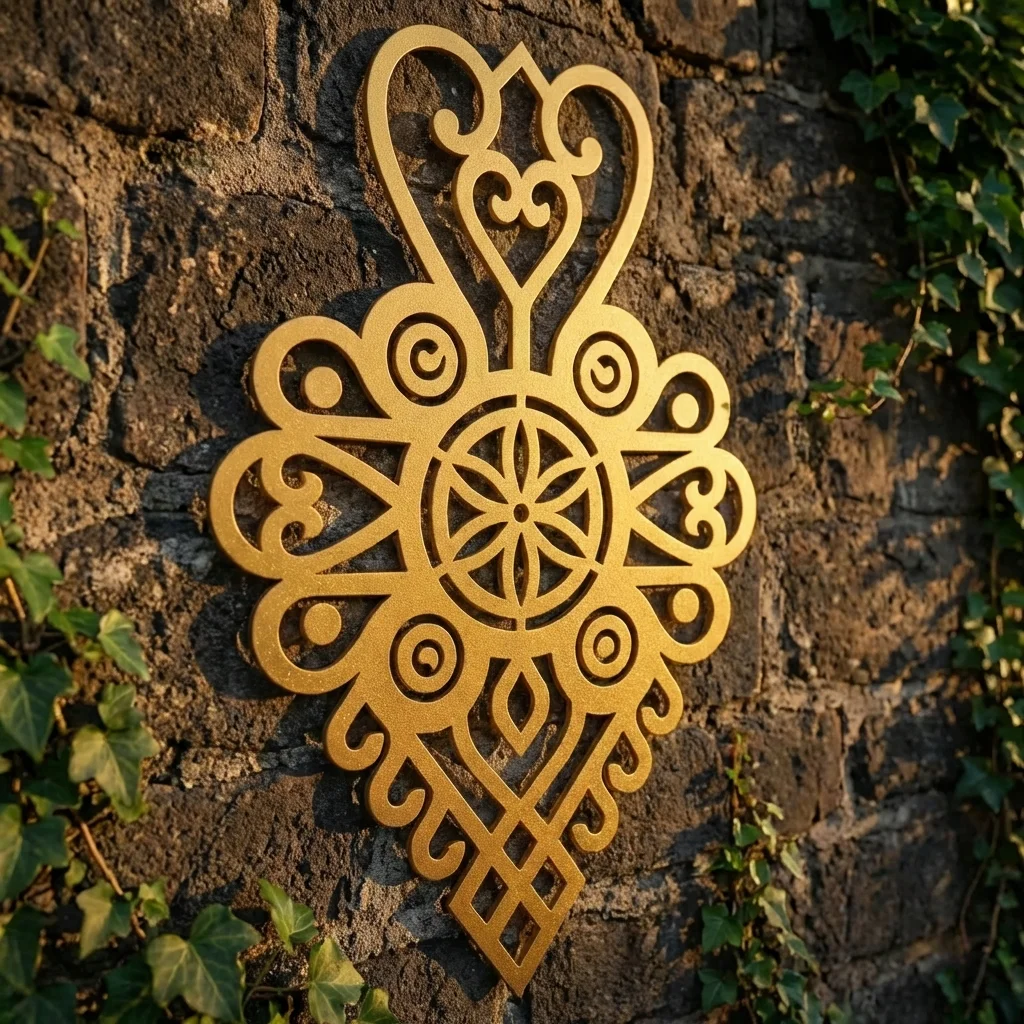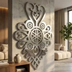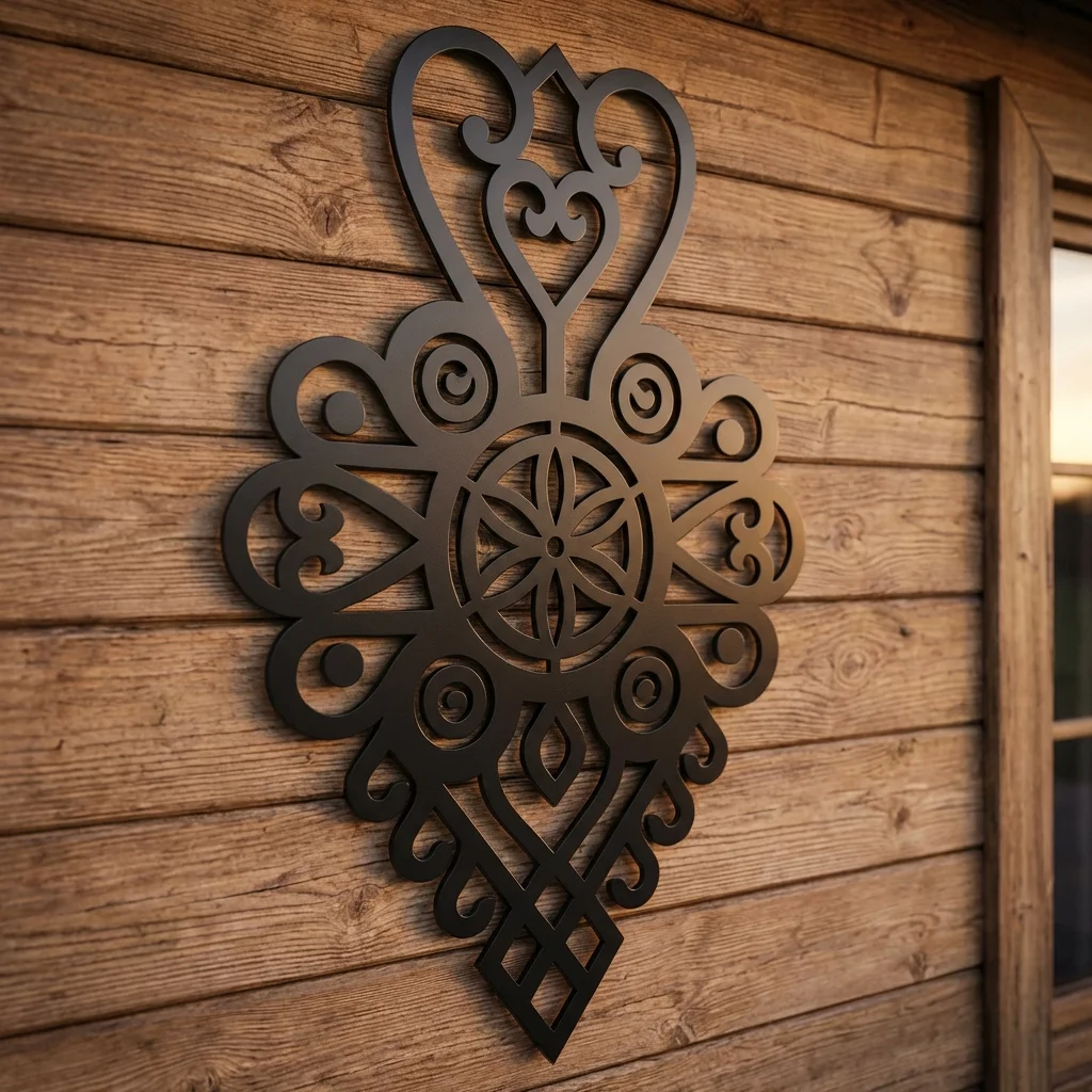 Metalowa dekoracja ścienna inspirowana wzornictwem Podhala to efektowna ozdoba do salonu, holu, apartamentu lub pensjonatu. Serce Rozety Podhalańskiej świetnie prezentuje się na drewnie, kamieniu, cegle i jasnych ścianach, dodając wnętrzu regionalnego charakteru w eleganckim wydaniu.