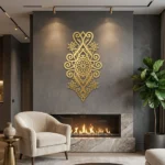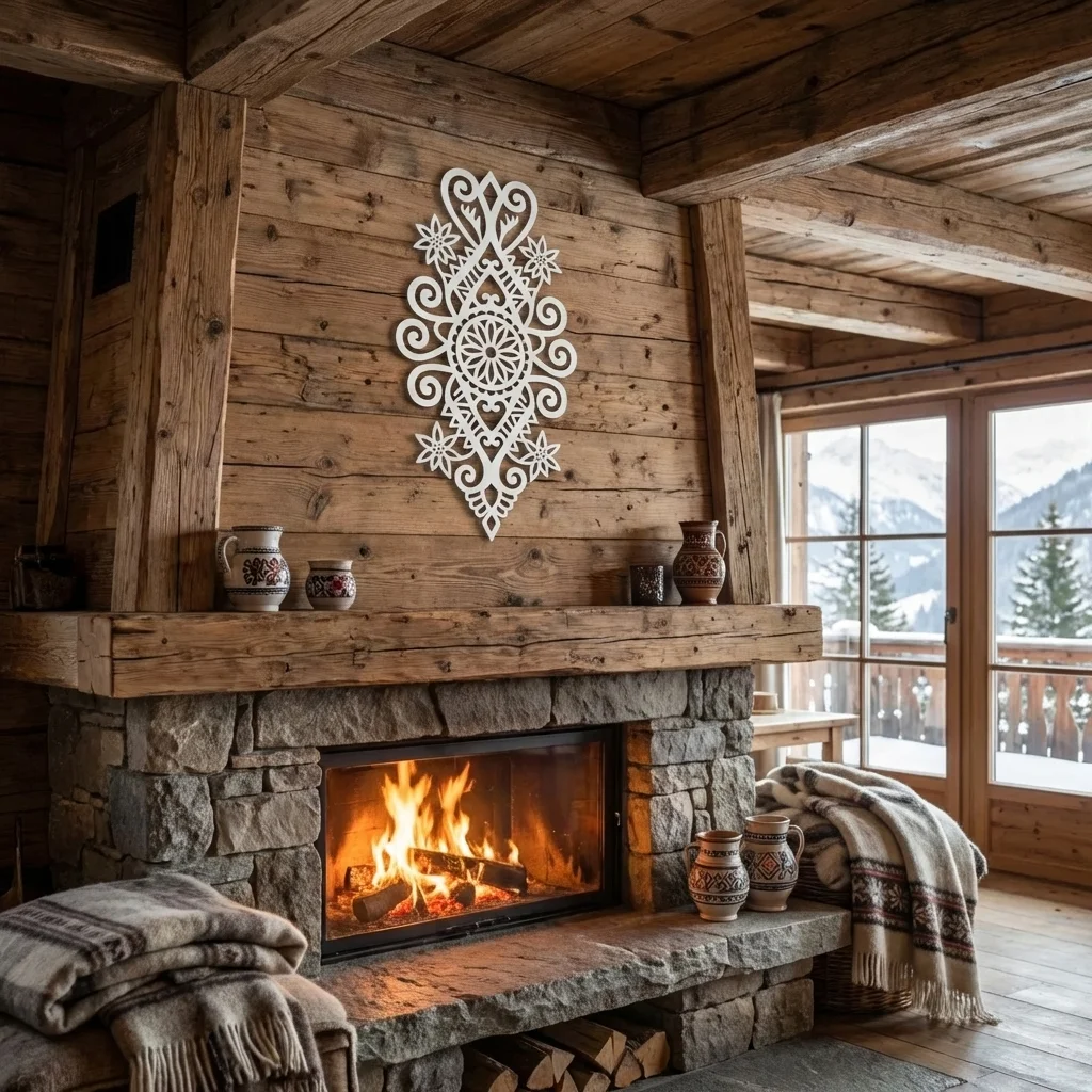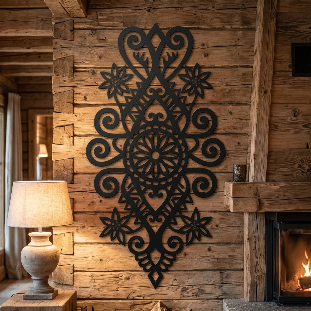 Metalowa dekoracja ścienna inspirowana wzornictwem Podhala to efektowna ozdoba do salonu, holu, apartamentu lub pensjonatu. Słoneczna Rozeta Podhalańska świetnie prezentuje się na jasnych ścianach, cegle i drewnie, dodając wnętrzu regionalnego charakteru w eleganckim wydaniu.