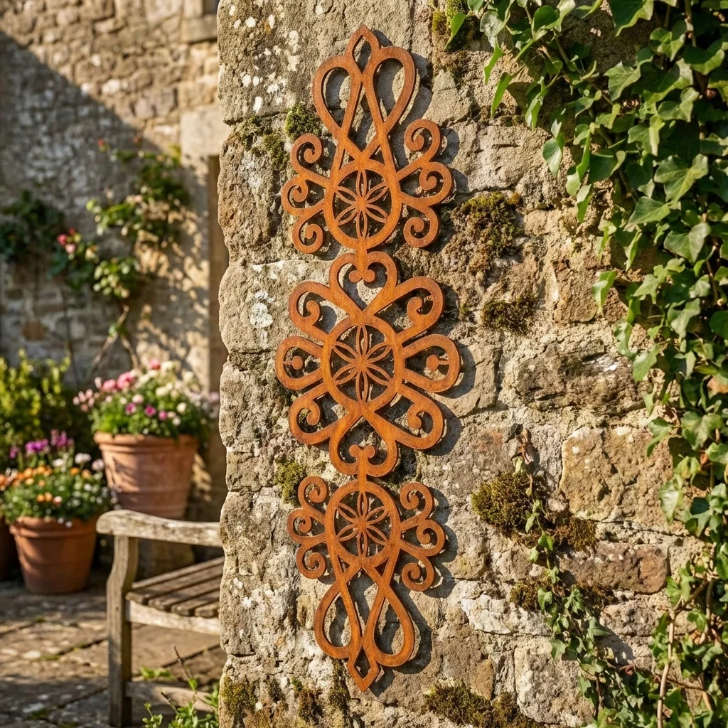 Dekor ścienny metalowy góralski Tryptyk Podhalański to pionowa ozdoba ścienna inspirowana wzornictwem Podhala. Kompozycja trzech połączonych ornamentów tworzy elegancki, wyrazisty akcent dekoracyjny, który świetnie prezentuje się na drewnianych ścianach, w salonach, korytarzach, strefach wejściowych oraz wnętrzach o regionalnym lub nowoczesnym charakterze.