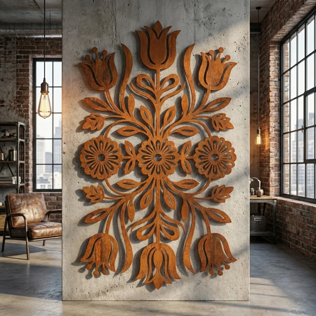 Dekor został zaprojektowany tak, aby przyciągać wzrok formą i detalem. Ażurowy układ linii nadaje mu lekkości, a wyrazisty roślinny wzór sprawia, że świetnie sprawdza się jako główna ozdoba ściany w salonie, przedpokoju, jadalni, gabinecie, pensjonacie lub przestrzeni komercyjnej. To połączenie nowoczesnego metalu z inspiracją kaszubską, które buduje klimat i podkreśla charakter wnętrza.