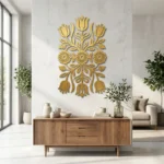 Dekor ścienny metalowy kaszubski – Kaszubski Bukiet Kwiatów to elegancka metalowa ozdoba ścienna inspirowana tradycyjnym wzornictwem kaszubskim. Symetryczny motyw tulipanów, rozet i roślinnych ornamentów pięknie podkreśla charakter wnętrza i świetnie pasuje do aranżacji naturalnych, rustykalnych oraz nowoczesnych.