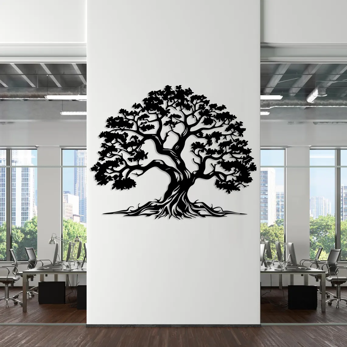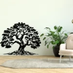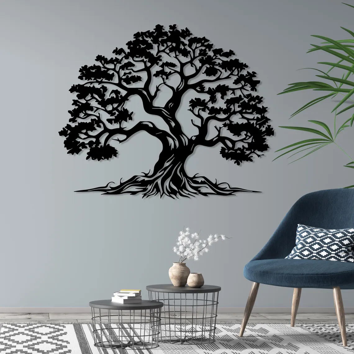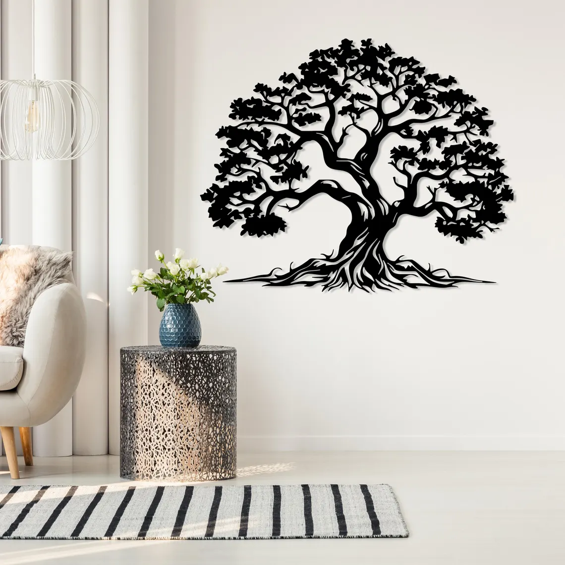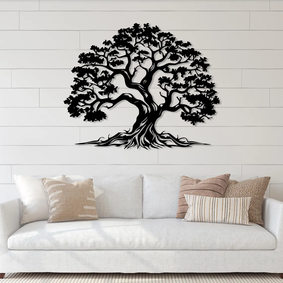 Dekoracja metalowa przedstawiająca Drzewo Życia. Precyzyjnie wycinana laserowo, malowana proszkowo na czarno lub w cortenie, idealna do wnętrz i ogrodów.