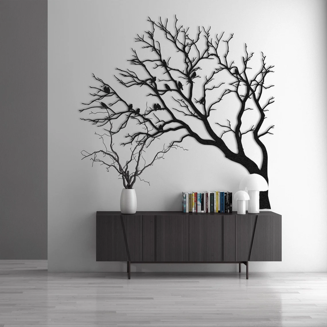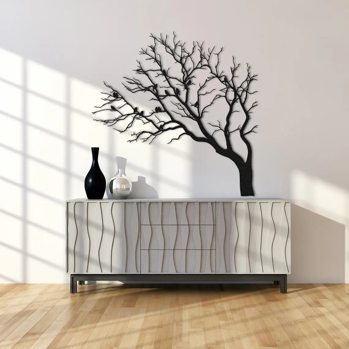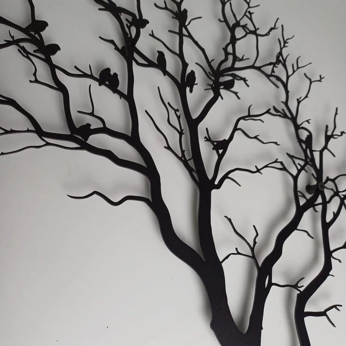 Elegancka dekoracja ścienna w formie gałęzi drzewa z ptakami. Wykonana z metalu ciętego laserowo, malowana proszkowo na czarno lub dostępna w cortenie.