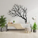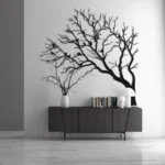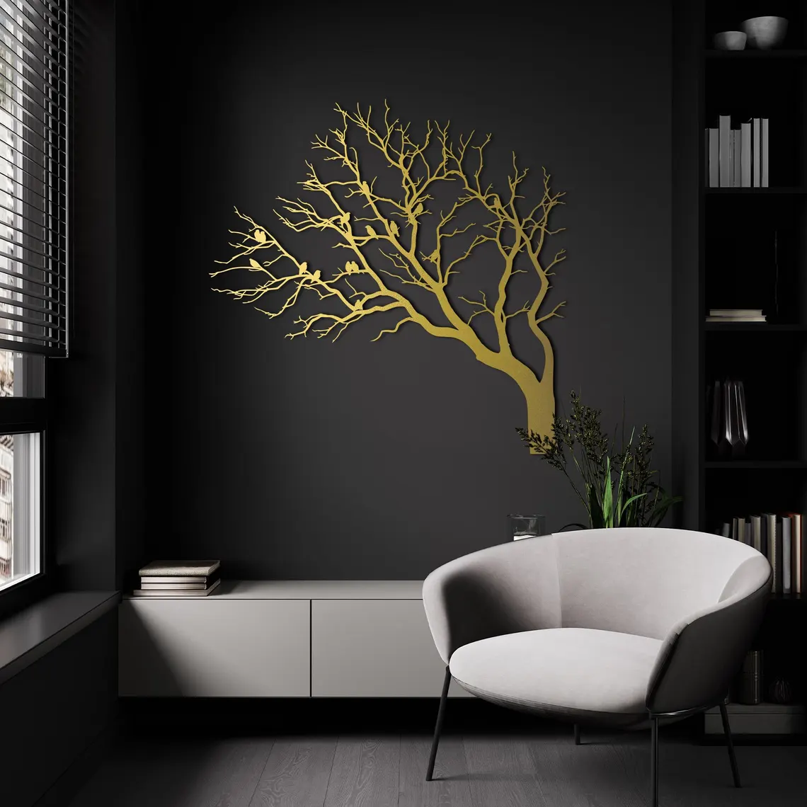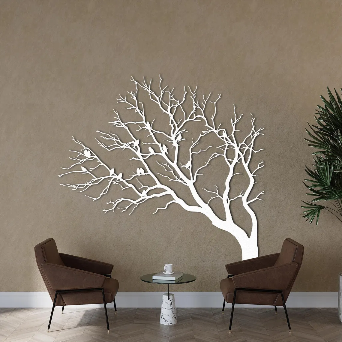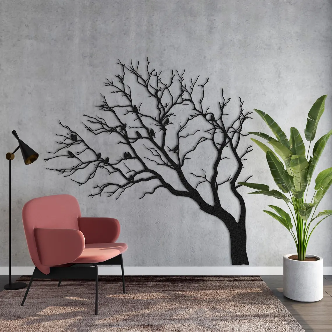 Elegancka dekoracja ścienna w formie gałęzi drzewa z ptakami. Wykonana z metalu ciętego laserowo, malowana proszkowo na czarno lub dostępna w cortenie.