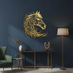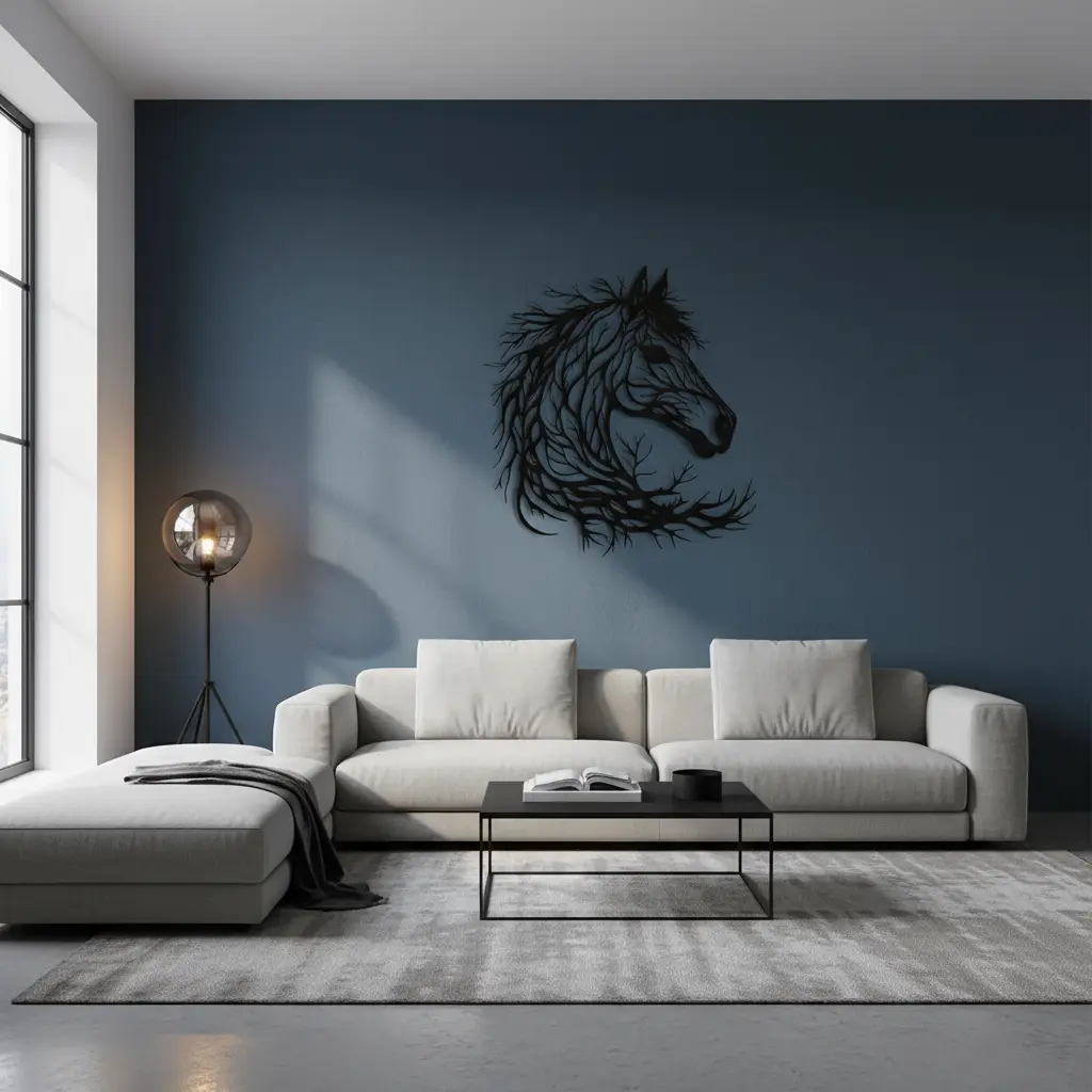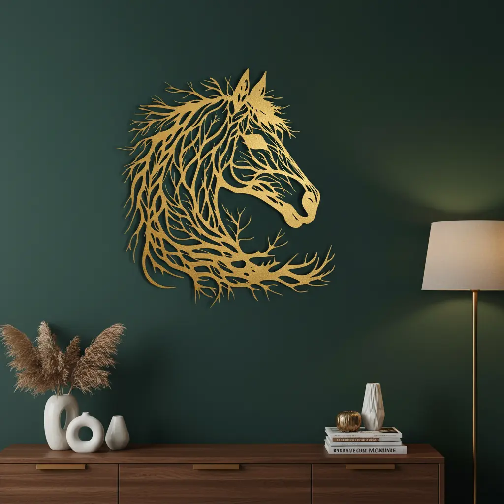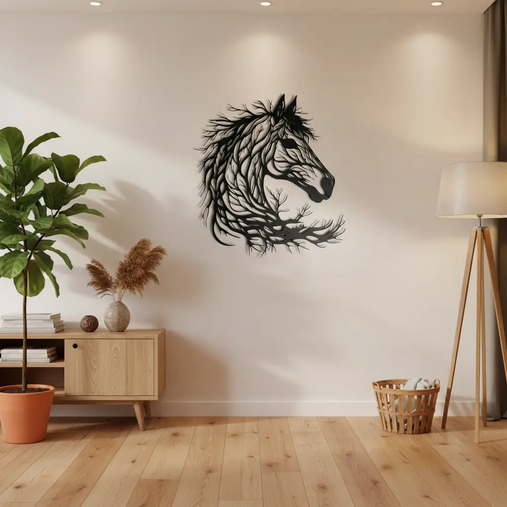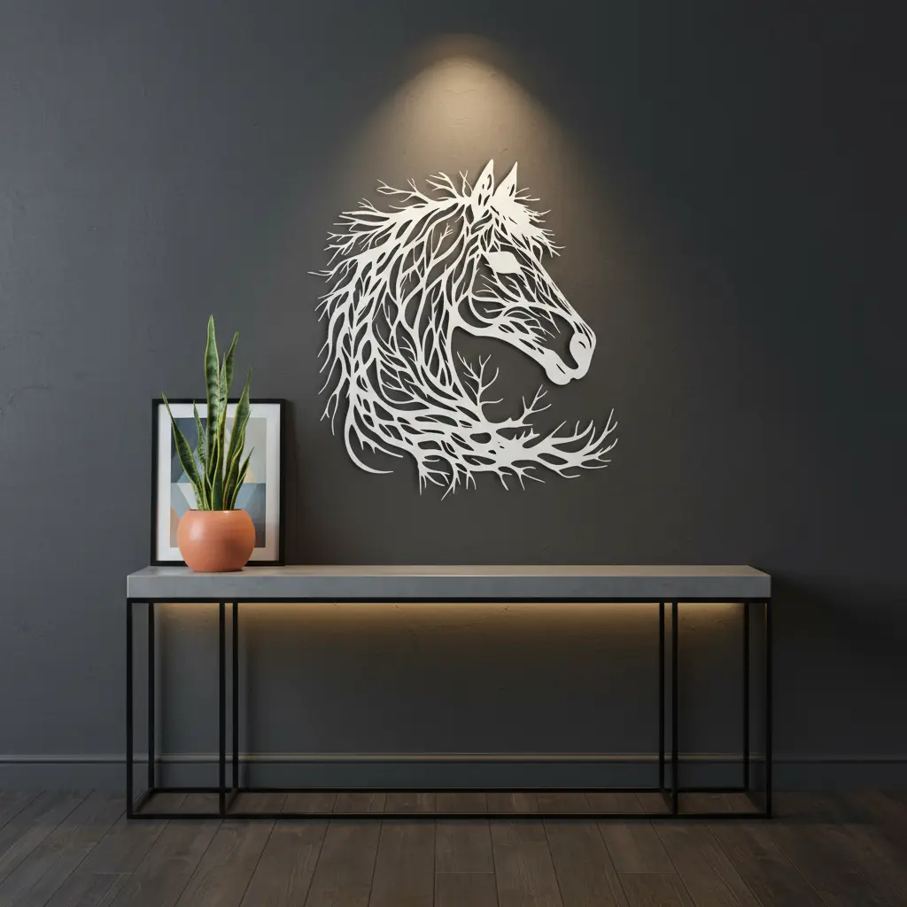 Dekoracja Metalowa Koń w Gałęziach – unikalna ozdoba ścienna łącząca motyw zwierzęcy i naturę. Wykonana ze stali ciętej laserowo, dostępna w wersji malowanej proszkowo na czarno, biało, złoto lub ze stali corten.
