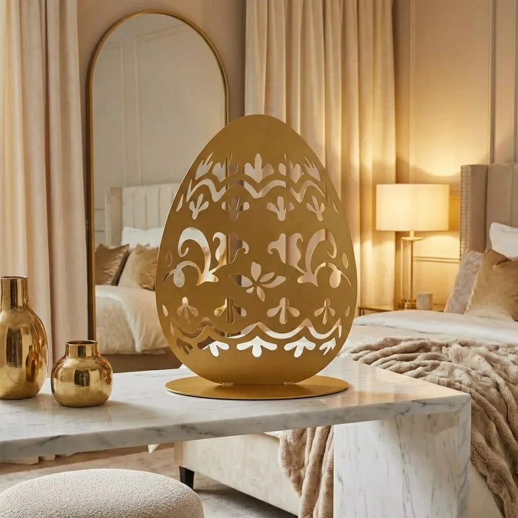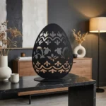 Dekoracja metalowa wolnostojąca jajko „Jajo Natury” to lekka, ażurowa rzeźba inspirowana motywami roślinnymi i ludowymi. Dzięki stabilnej podstawie świetnie prezentuje się na stole, komodzie lub konsoli, dodając wnętrzu ciepłego, wiosennego klimatu. Pasuje do stylu boho, skandynawskiego, rustykalnego oraz nowoczesnych aranżacji.