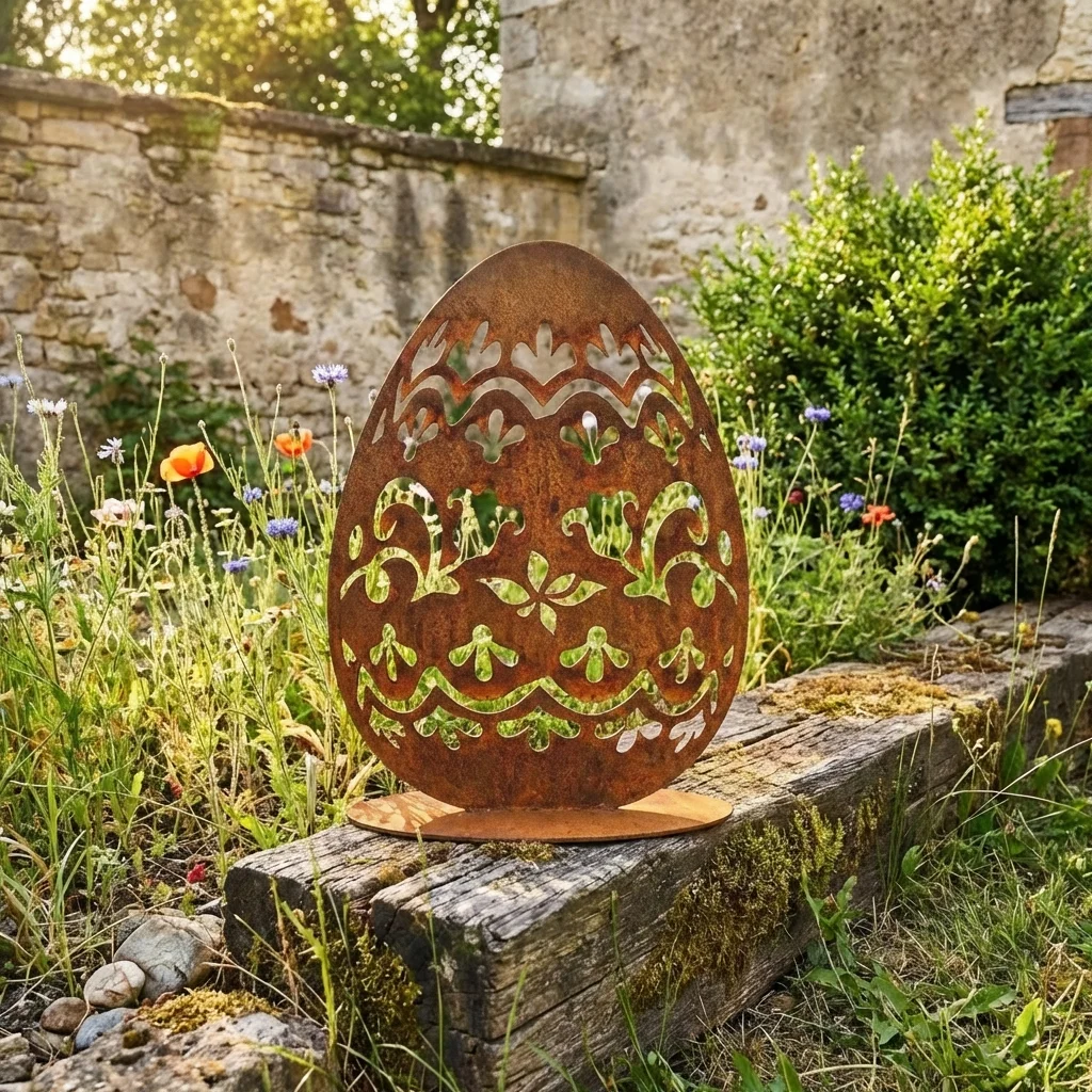 Dekoracja metalowa wolnostojąca jajko „Jajo Natury” – ażurowa rzeźba z roślinnym wzorem, idealna do salonu, na stół i komodę oraz jako elegancka dekoracja wielkanocna. Rozmiary: 11×15 cm, 15×20 cm, 18×25 cm. Wykończenia: corten (rdzawy), czarny, biały, złoty lub stal nierdzewna polerowana/szczotkowana. Darmowa dostawa na terenie Polski.