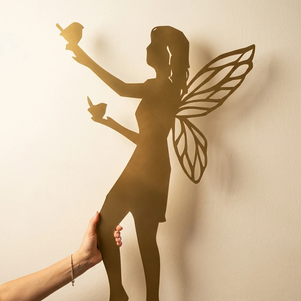 Dekoracja ogrodowa wróżka do wbicia w ziemię „Opiekunka Ogrodu” – metalowa sylwetka z dużymi ażurowymi skrzydłami i motywem ptaszków. Rozmiary: 27×40 cm (szpilka 23 cm), 34×50 cm (szpilka 29 cm), 40×60 cm (szpilka 34 cm). Wykończenia: corten, czarny, biały, złoty oraz stal nierdzewna szczotkowana. Darmowa dostawa.