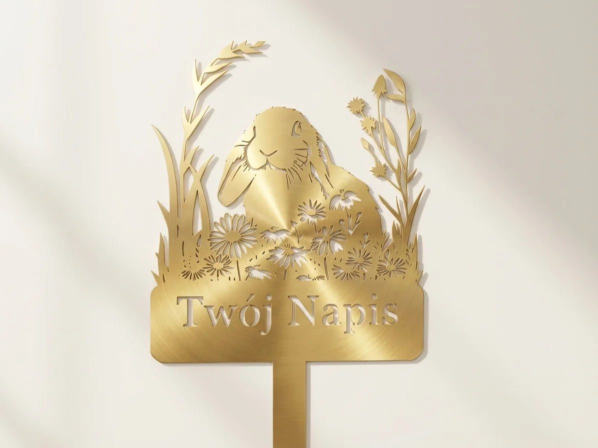 Dekoracja ogrodowa z napisem do wbicia w ziemię „Witaj w Ogrodzie” (personalizowana) – metalowa tabliczka z uroczym motywem króliczka. Rozmiary: 36×40 cm (szpilka 23 cm), 45×50 cm (szpilka 29 cm), 54×60 cm (szpilka 34 cm). Po zakupie prześlij nam treść napisu do wykonania. Wykończenia: corten, czarny, biały, złoty oraz stal nierdzewna szczotkowana. Darmowa dostawa.