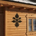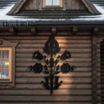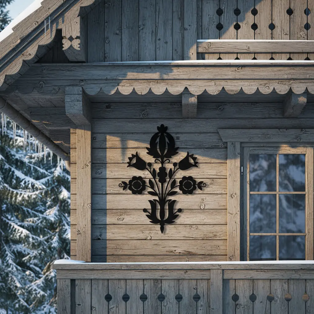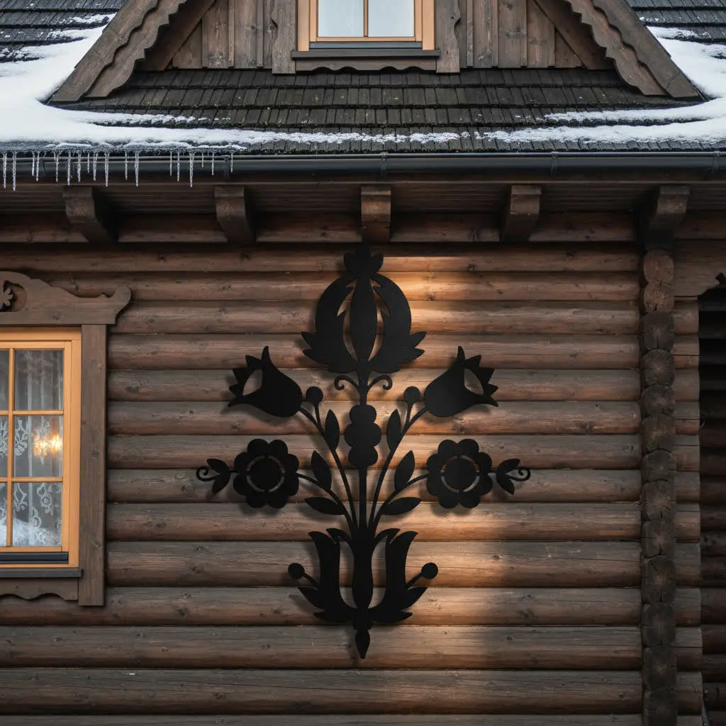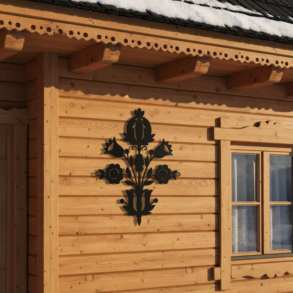 Metalowa dekoracja ścienna z motywem stylizowanych kwiatów inspirowanych sztuką Podhala. Subtelna i elegancka ozdoba dla wnętrz w stylu rustykalnym i nowoczesnym.