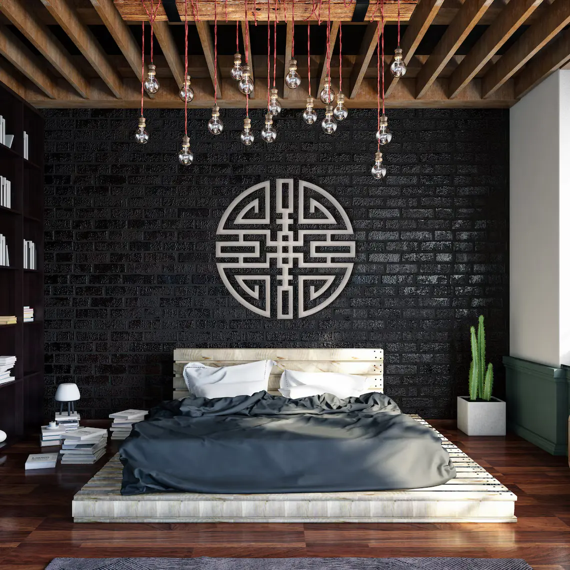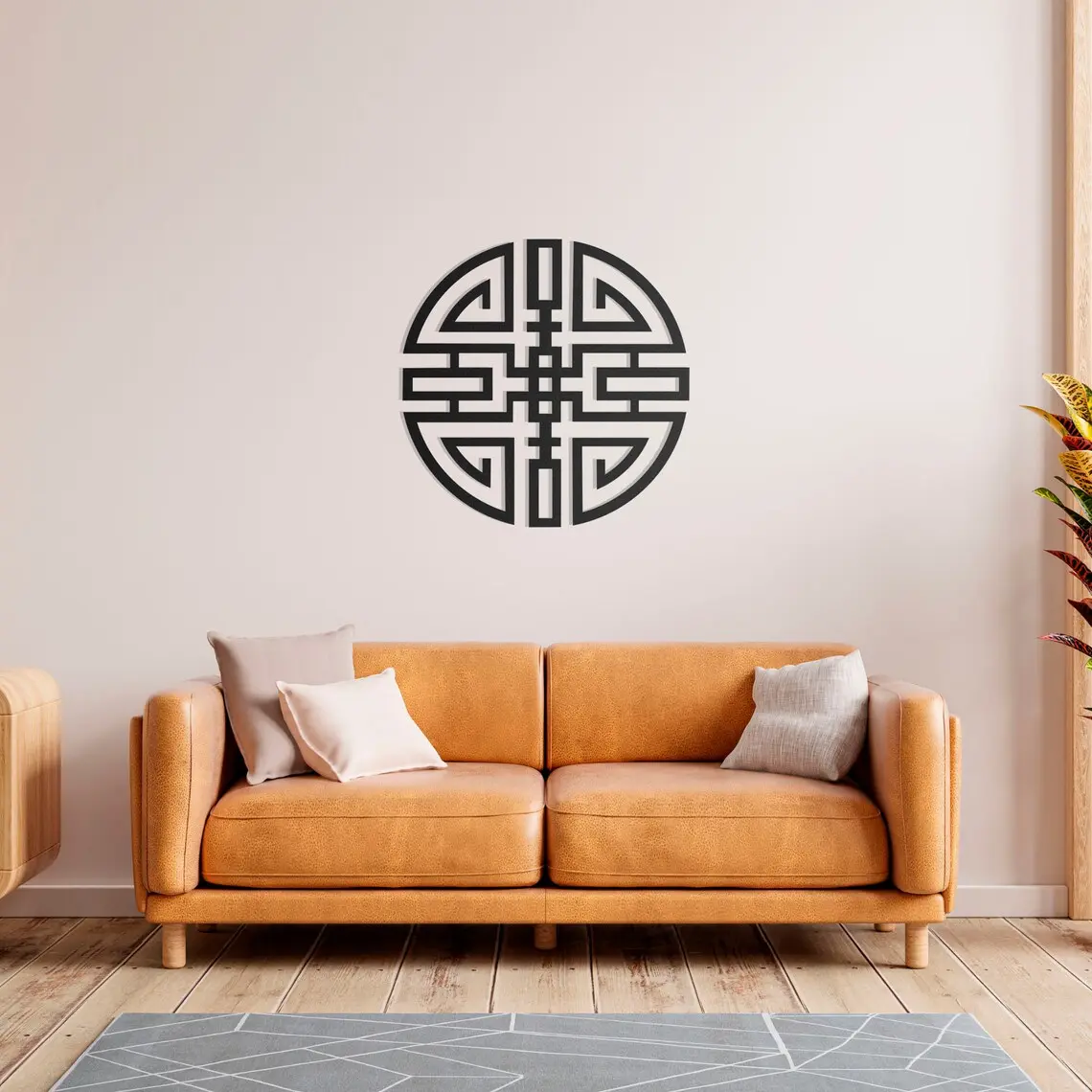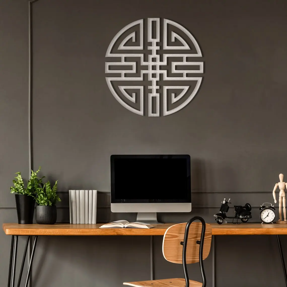Dekoracja ścienna metalowa Krąg Spokoju to wyjątkowy akcent wnętrzarski, który łączy w sobie prostotę i symbolikę. Okrągły kształt i symetryczny geometryczny wzór inspirowany orientalnymi motywami wprowadza atmosferę równowagi i harmonii.