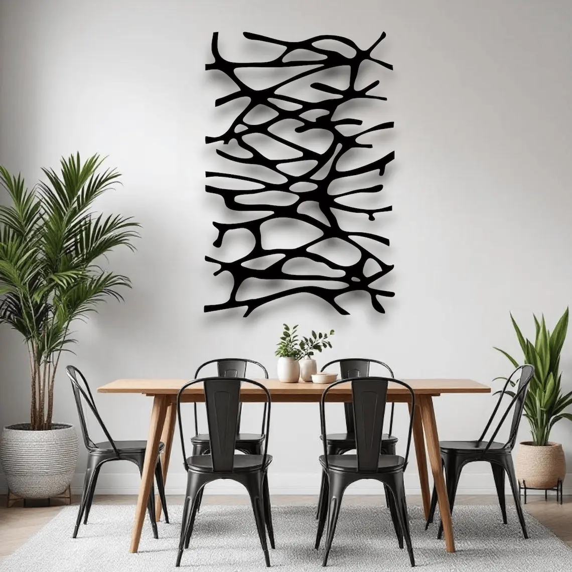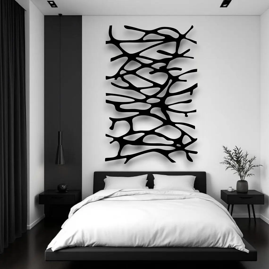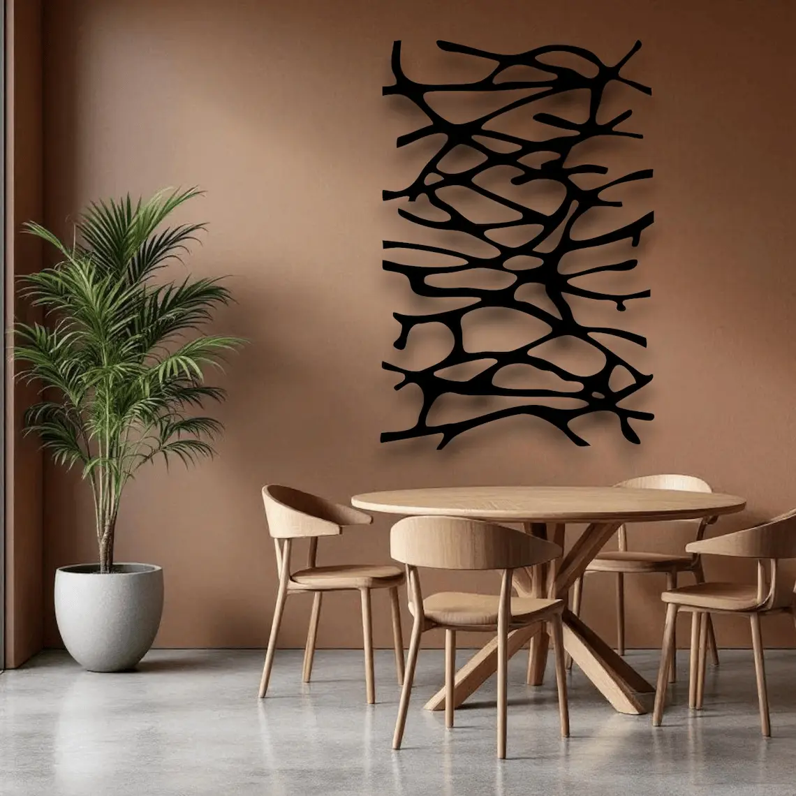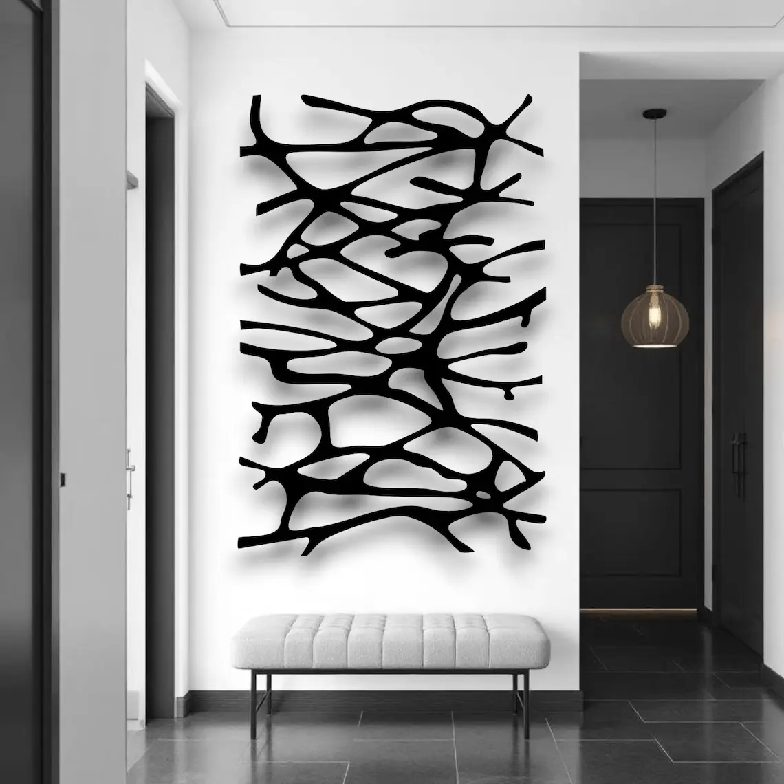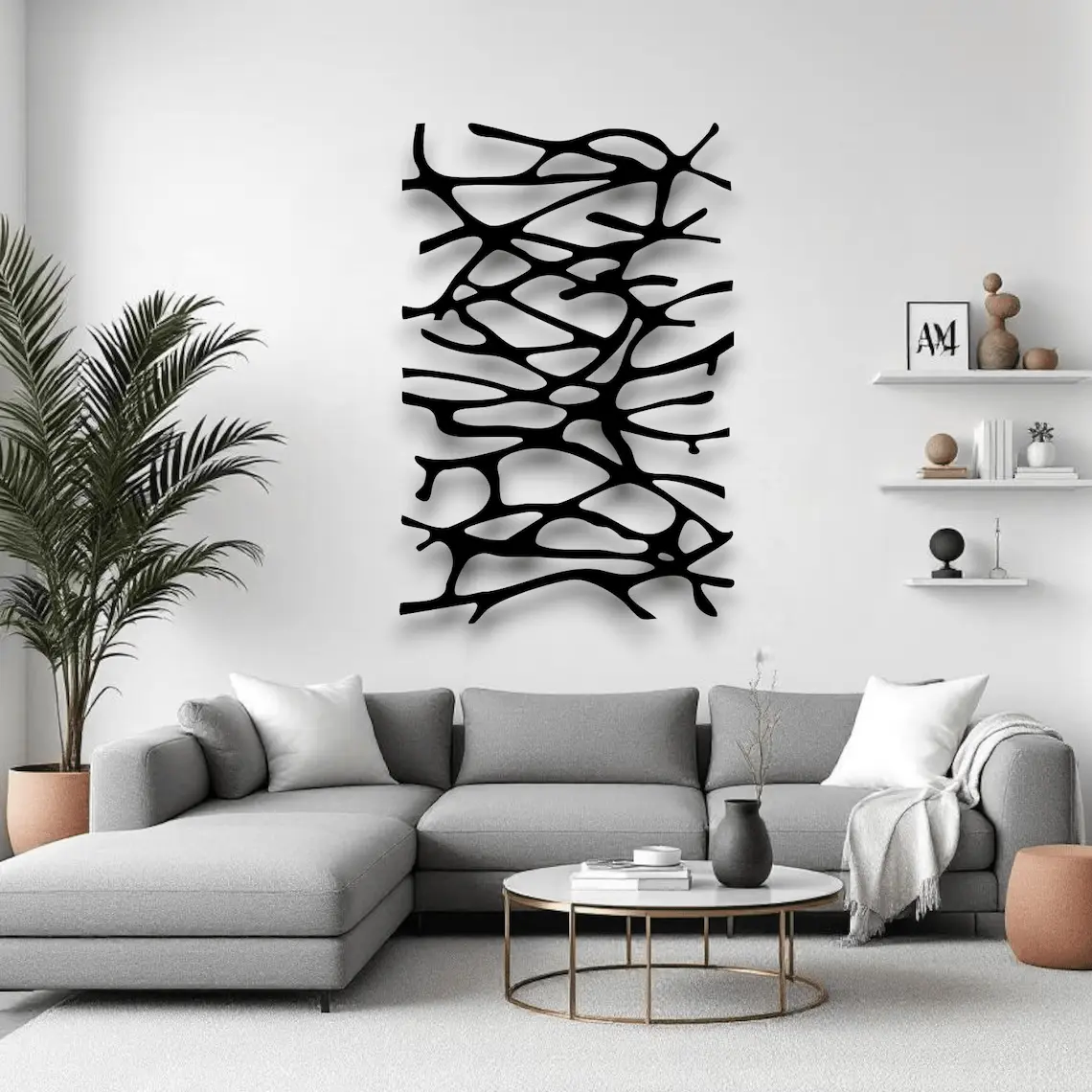 Dekoracja ścienna metalowa o organicznym wzorze „Root Lines”. Dynamiczny splot linii inspirowany naturą nadaje wnętrzu nowoczesnego charakteru i oryginalnego stylu.