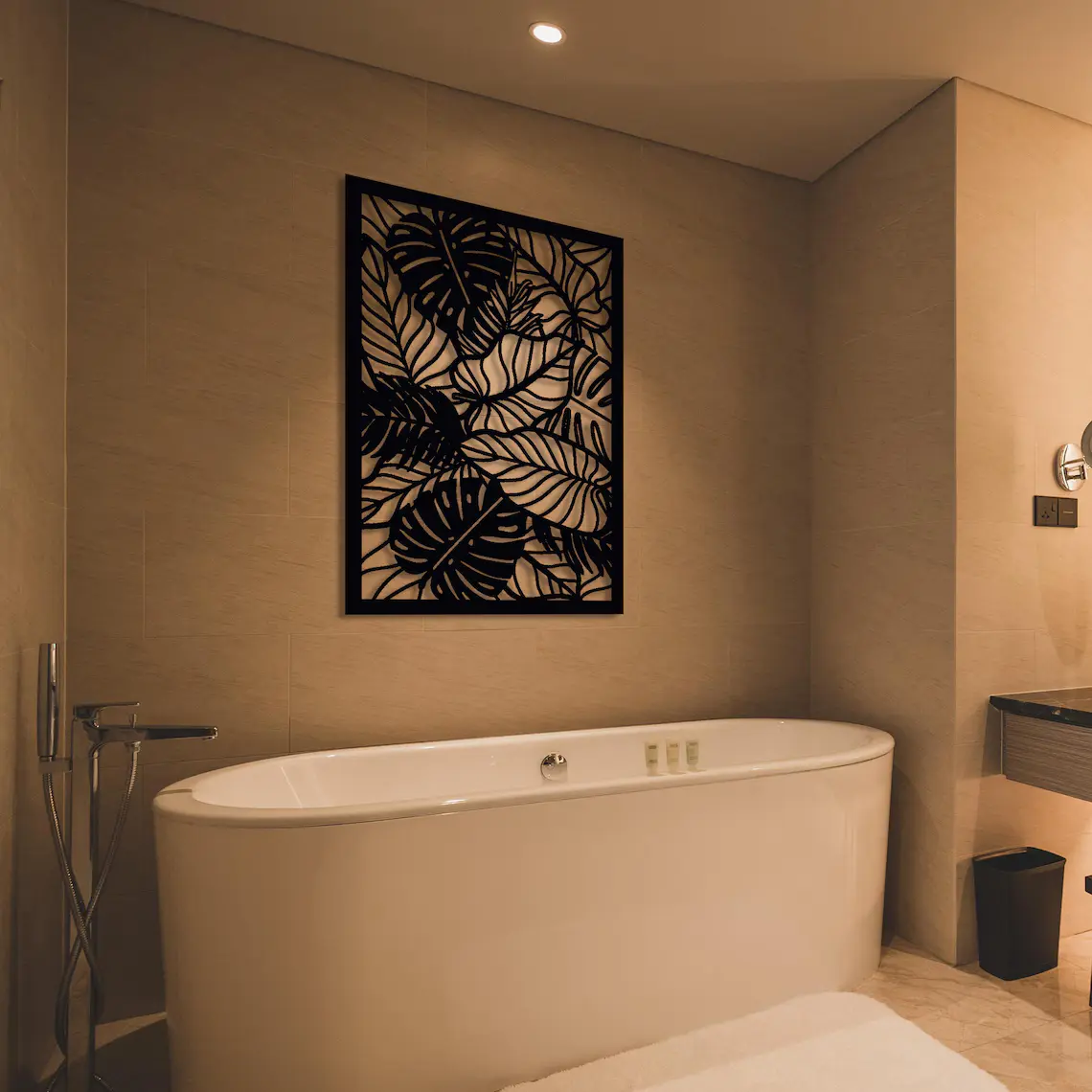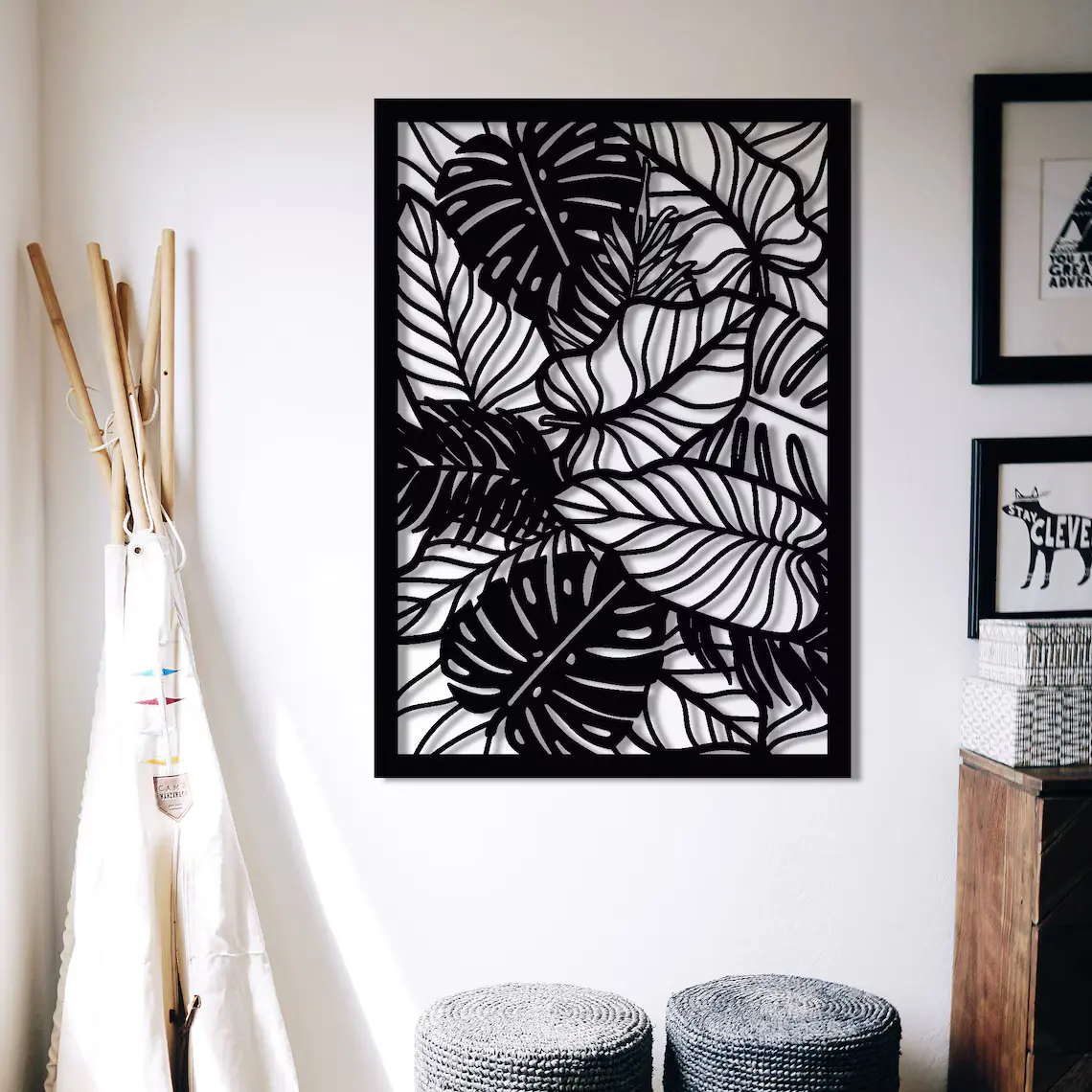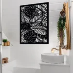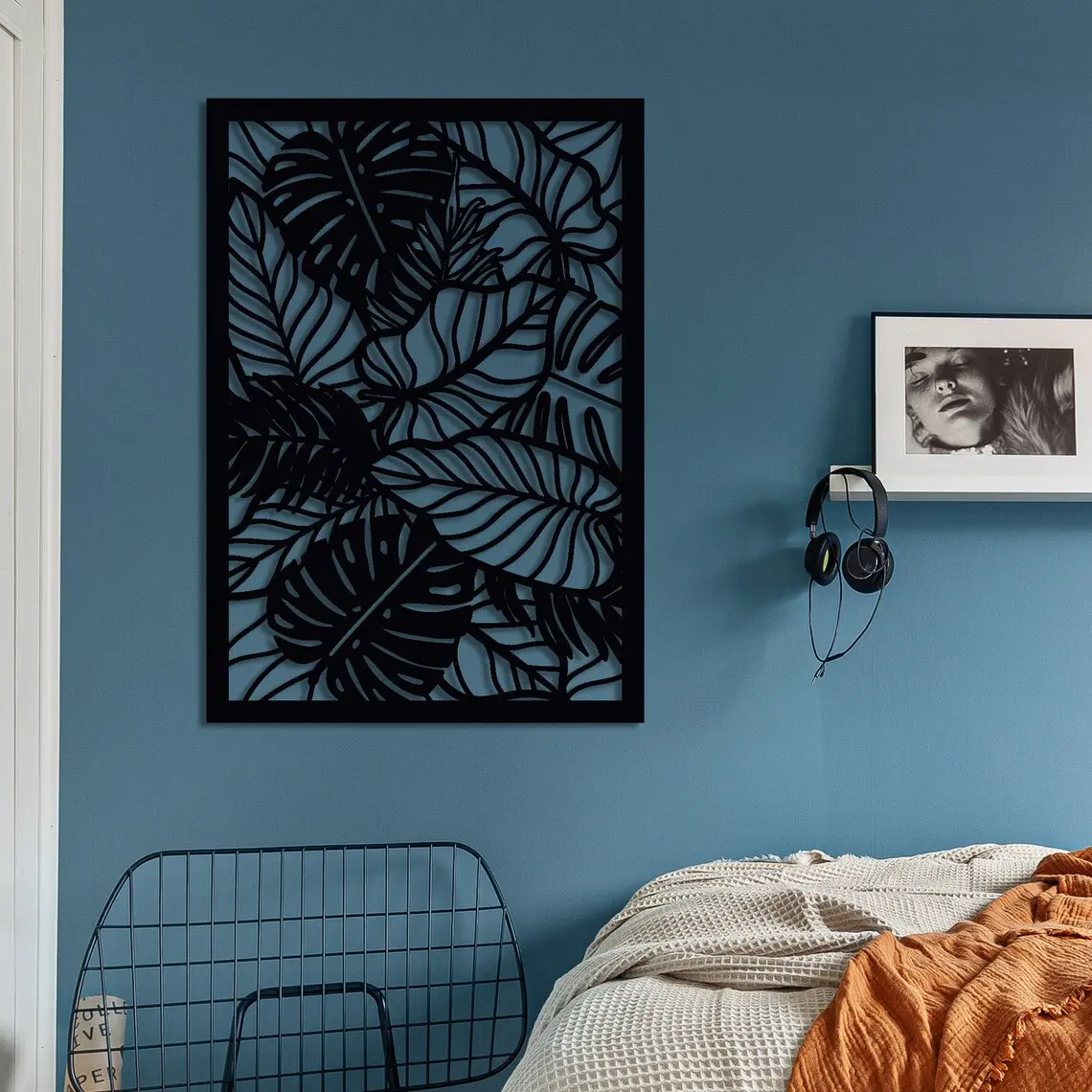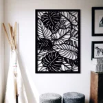 Dekoracja Ścienna Metalowa Tropical Leaves to wyjątkowy panel ścienny inspirowany tropikalną roślinnością. Wzór przedstawia liście monstery, kalatei i innych egzotycznych roślin, które wprowadzają do wnętrza naturalny klimat i nutę elegancji.