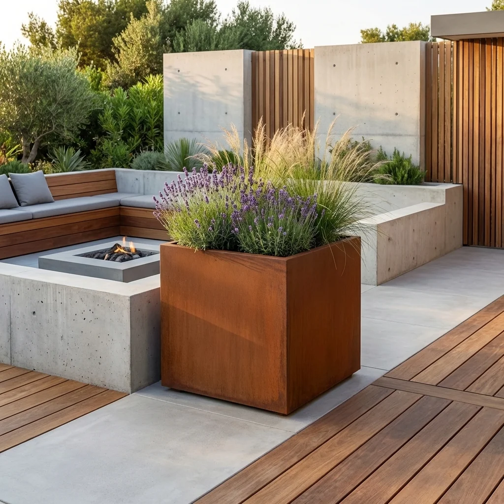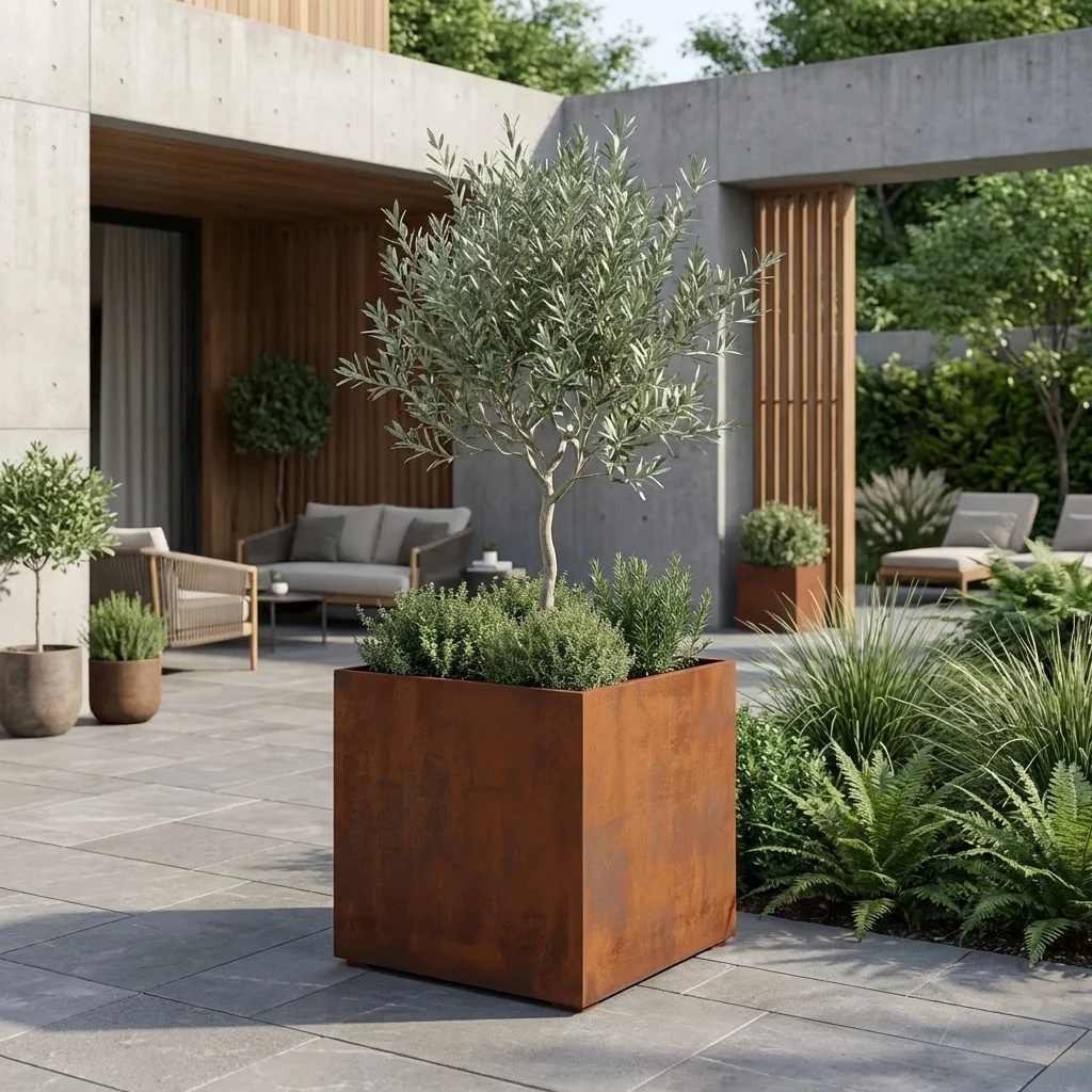 Wykończenie w stylu corten przyciąga uwagę ciepłym, szlachetnym wyglądem i doskonale współgra z zielenią roślin, trawami ozdobnymi, krzewami oraz niewielkimi drzewkami. Kwadratowa forma nadaje przestrzeni uporządkowany i designerski charakter, a sama donica może pełnić zarówno funkcję użytkową, jak i dekoracyjną.