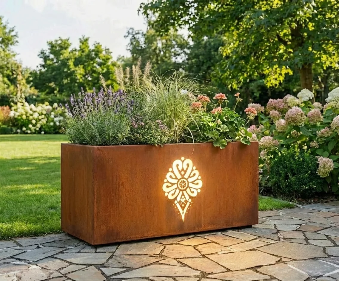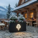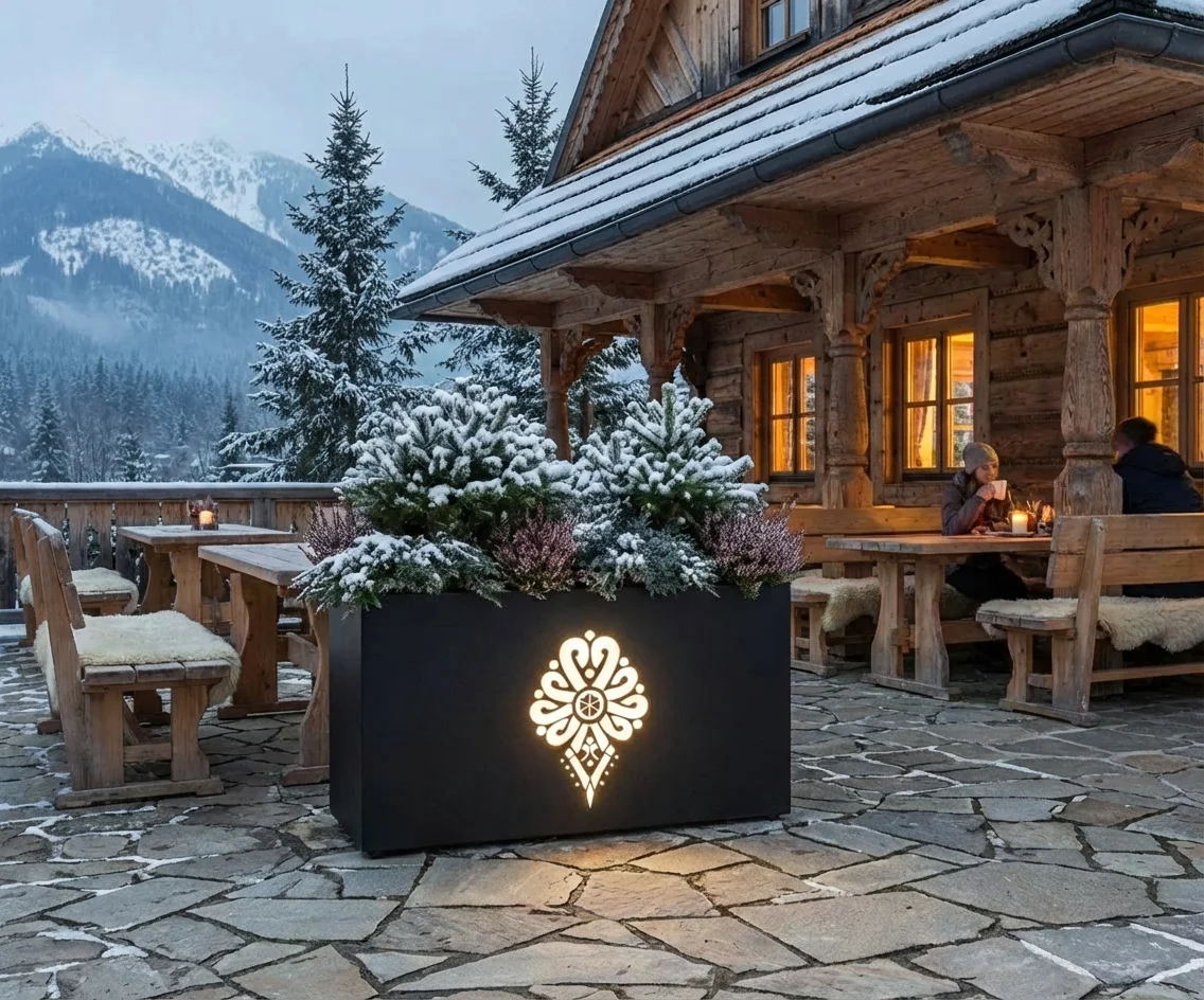 Donica LED Góralska Parzenica Podhalańska to ekskluzywna donica metalowa z podświetleniem LED i możliwością wycięcia oraz podświetlenia Twojego logo. To prestiżowy element dekoracyjny do hoteli, pensjonatów i restauracji – szczególnie tam, gdzie liczy się styl góralski i efekt „wow” już od wejścia.