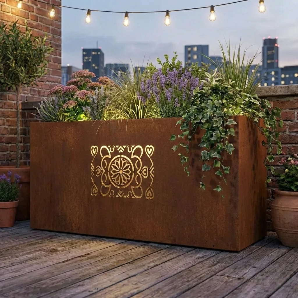 Donica LED góralska Rozeta Podhalańska to nowoczesna, metalowa donica z dekoracyjnym wycięciem inspirowanym wzornictwem podhalańskim oraz podświetleniem LED. Model ten świetnie sprawdza się jako reprezentacyjny element aranżacji przy wejściu do obiektu, na tarasie, patio lub w przestrzeni komercyjnej, gdzie liczy się mocny efekt wizualny także po zmroku.