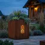 Donica LED kaszubska – Kaszubska Wieża Tulipanów to nowoczesna metalowa donica z pionowym podświetlanym ornamentem inspirowanym kaszubskim wzornictwem. Dekoracyjny motyw tulipanowy pięknie prezentuje się po zmroku, tworząc wyjątkowy klimat w ogrodzie, na tarasie, patio lub przy wejściu do budynku.