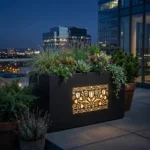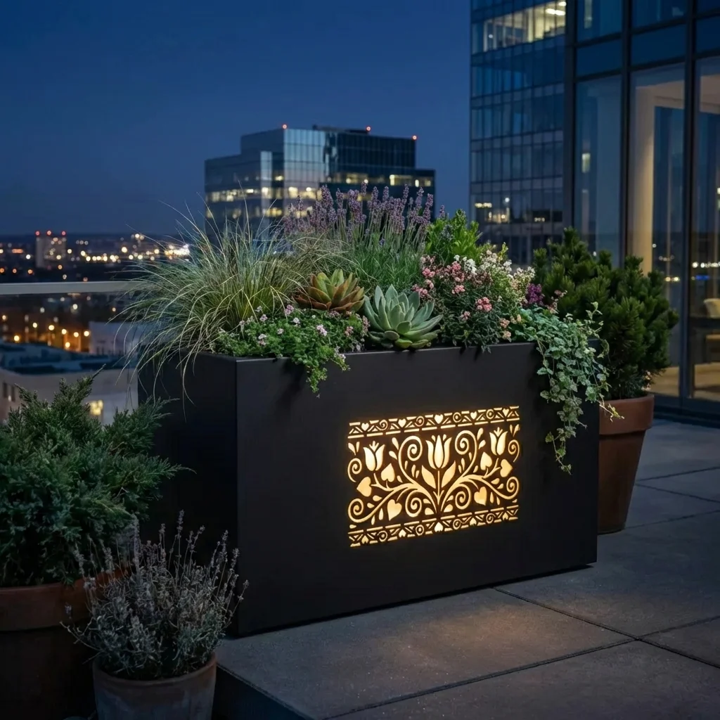 Donica LED kaszubska – Kaszubski Ogród Tulipanów to nowoczesna metalowa donica z szerokim podświetlanym ornamentem inspirowanym kaszubskim wzornictwem. Dekoracyjny motyw tulipanów pięknie prezentuje się po zmroku, tworząc wyjątkowy klimat w ogrodzie, na tarasie, patio lub przy wejściu do budynku.