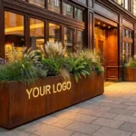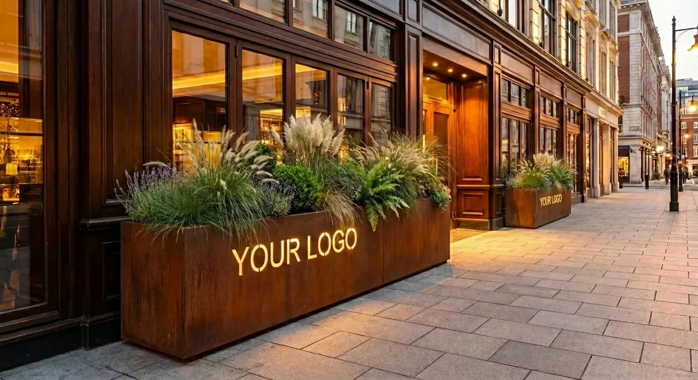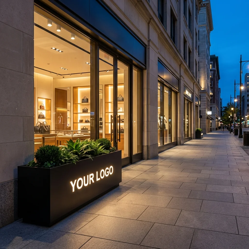 Podświetlenie LED eksponuje logo w efektowny, ale estetyczny sposób. Dzięki temu donica staje się zauważalnym nośnikiem marki bez potrzeby stosowania dodatkowych kasetonów czy standów reklamowych.