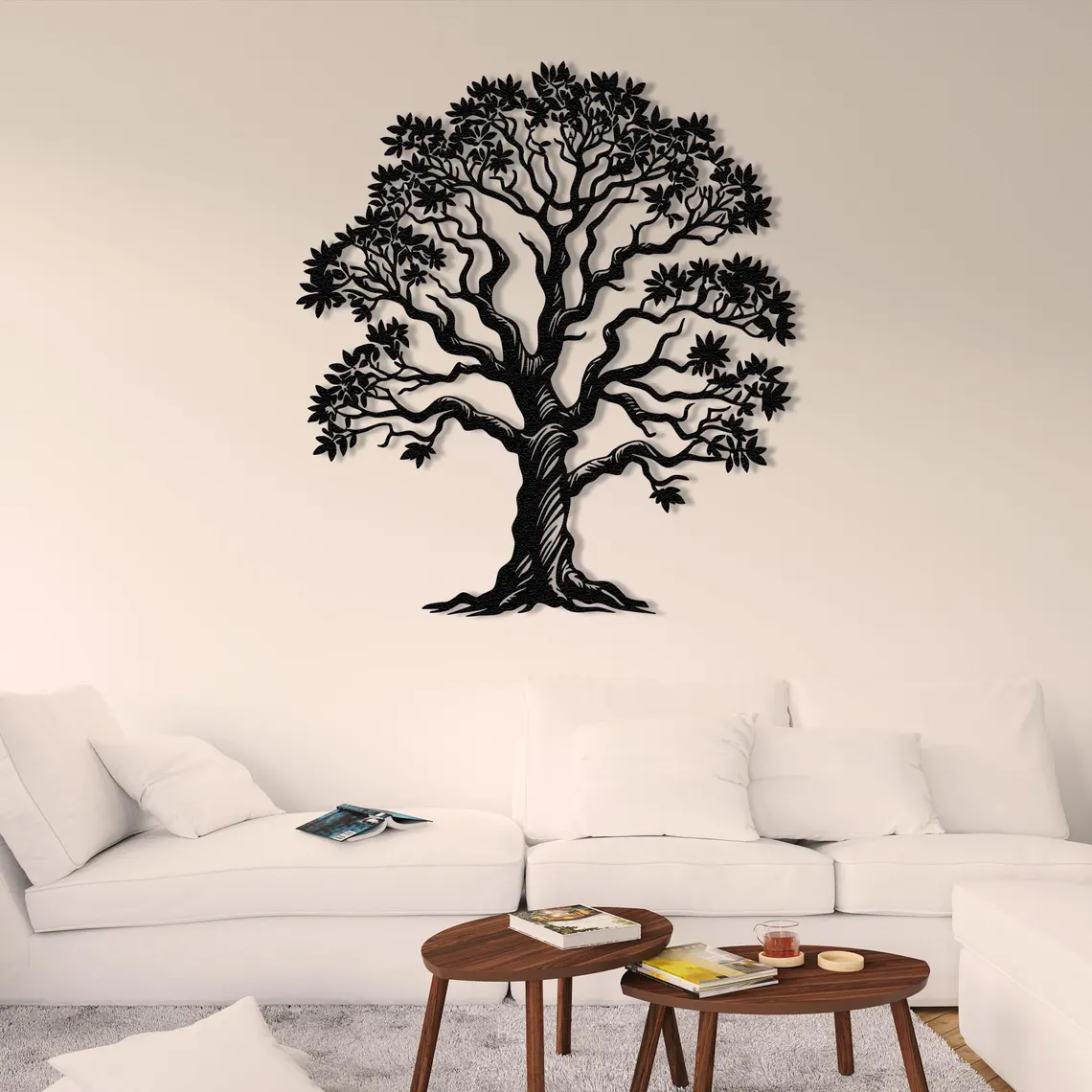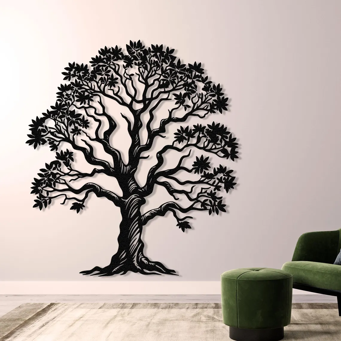 Dekoracja Metalowa Drzewo Życia z Liśćmi to unikalne połączenie natury i nowoczesnego designu. Precyzyjnie wycinana laserowo ze stali i malowana proszkowo na czarno, zachwyca detalami gałęzi oraz liści. Symbolizuje siłę, wzrost i harmonię, dzięki czemu świetnie sprawdzi się jako wyjątkowa ozdoba w salonie, sypialni, biurze czy przestrzeni komercyjnej.