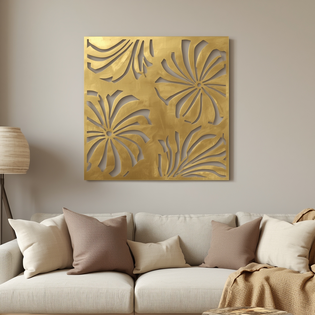 Panel dekoracyjny "Flora Lux" wycinany laserowo z metalu. Motyw inspirowany kwiatami w luksusowym złotym wykończeniu.