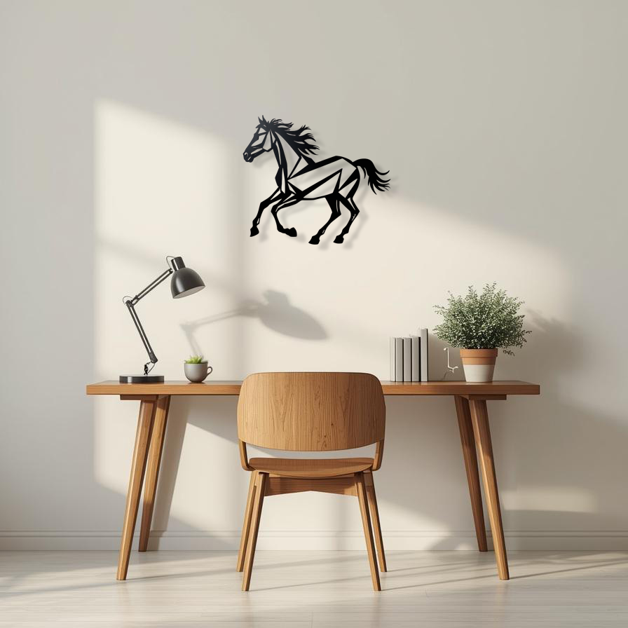Metalowa dekoracja ścienna przedstawiająca konia w biegu. Minimalistyczny design i solidne wykonanie sprawiają, że idealnie pasuje do wnętrz i przestrzeni zewnętrznych.
