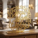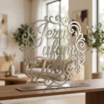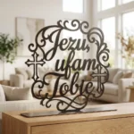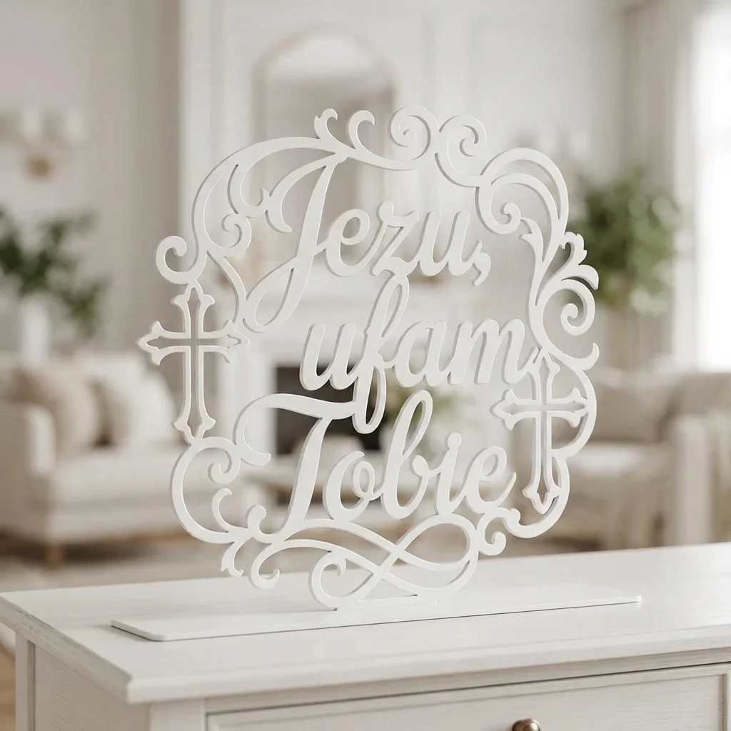 Jezu, Ufam Tobie Ornament – metalowa dekoracja wolnostojąca to elegancka ozdoba sakralna z przesłaniem, która łączy dekoracyjny napis z lekką, ażurową oprawą. Kaligraficzna forma, subtelne ornamenty i motywy krzyża sprawiają, że dekoracja pięknie prezentuje się na komodzie, konsoli, półce lub w domowym kąciku modlitwy, podkreślając duchowy charakter wnętrza.