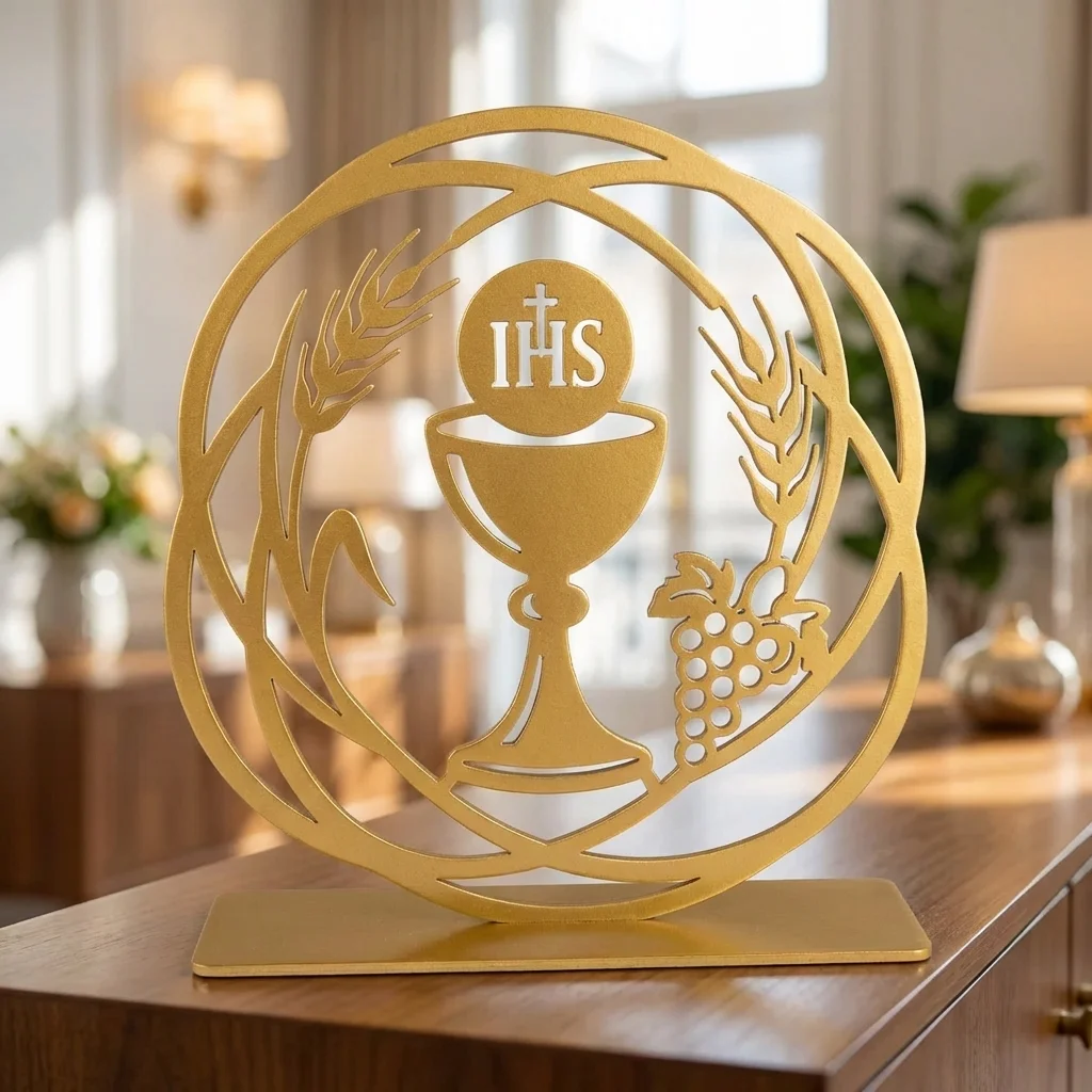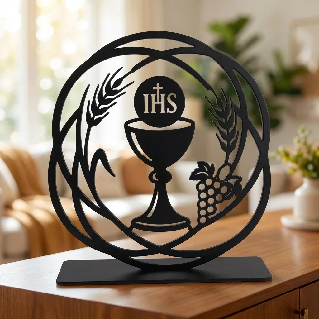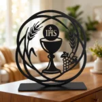 Kielich Eucharystyczny IHS to elegancka metalowa dekoracja wolnostojąca o wyraźnie sakralnym charakterze. Motyw kielicha z symbolem IHS nawiązuje do Eucharystii i sprawia, że ozdoba pięknie prezentuje się zarówno w domowym wnętrzu, jak i w przestrzeni modlitwy, kaplicy czy salce parafialnej. To subtelna, a jednocześnie wyrazista dekoracja religijna, która wnosi do aranżacji skupienie, symbolikę i ponadczasową formę.