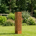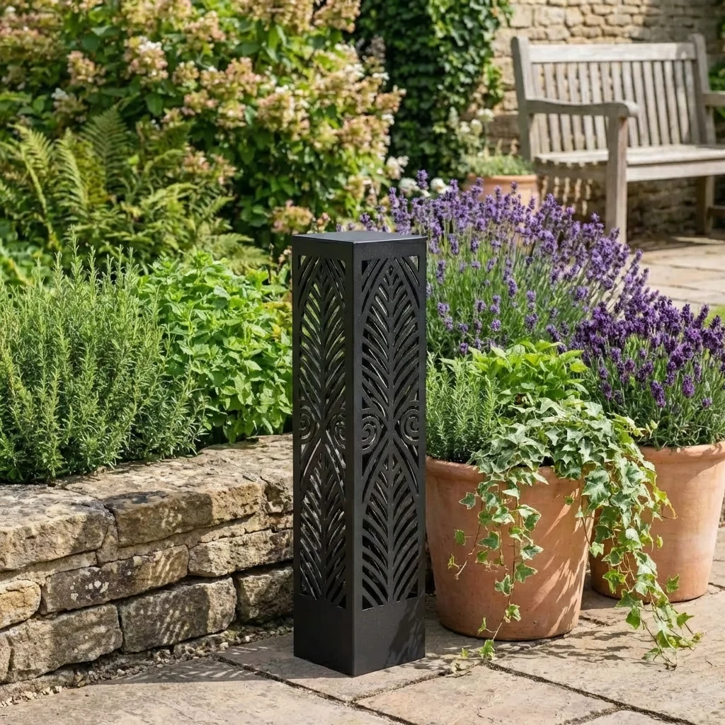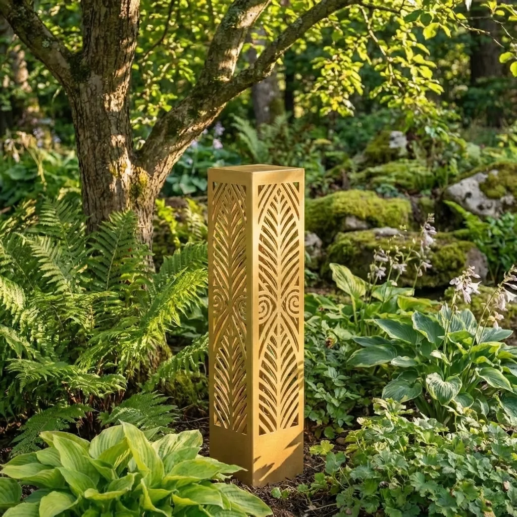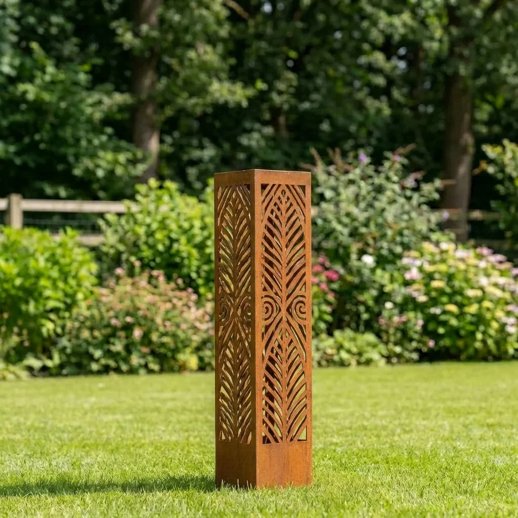 Harmonia Liści to elegancka kolumna ogrodowa inspirowana rytmem natury i botaniczną symetrią. Ażurowy wzór liści i delikatnych spiral tworzy subtelną grę światła i cienia, nadając przestrzeni lekkości, spokoju i designerskiego charakteru.