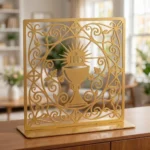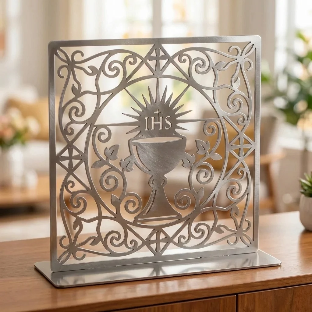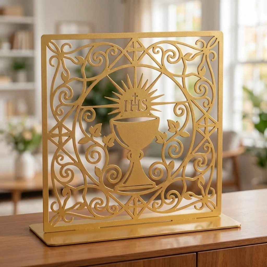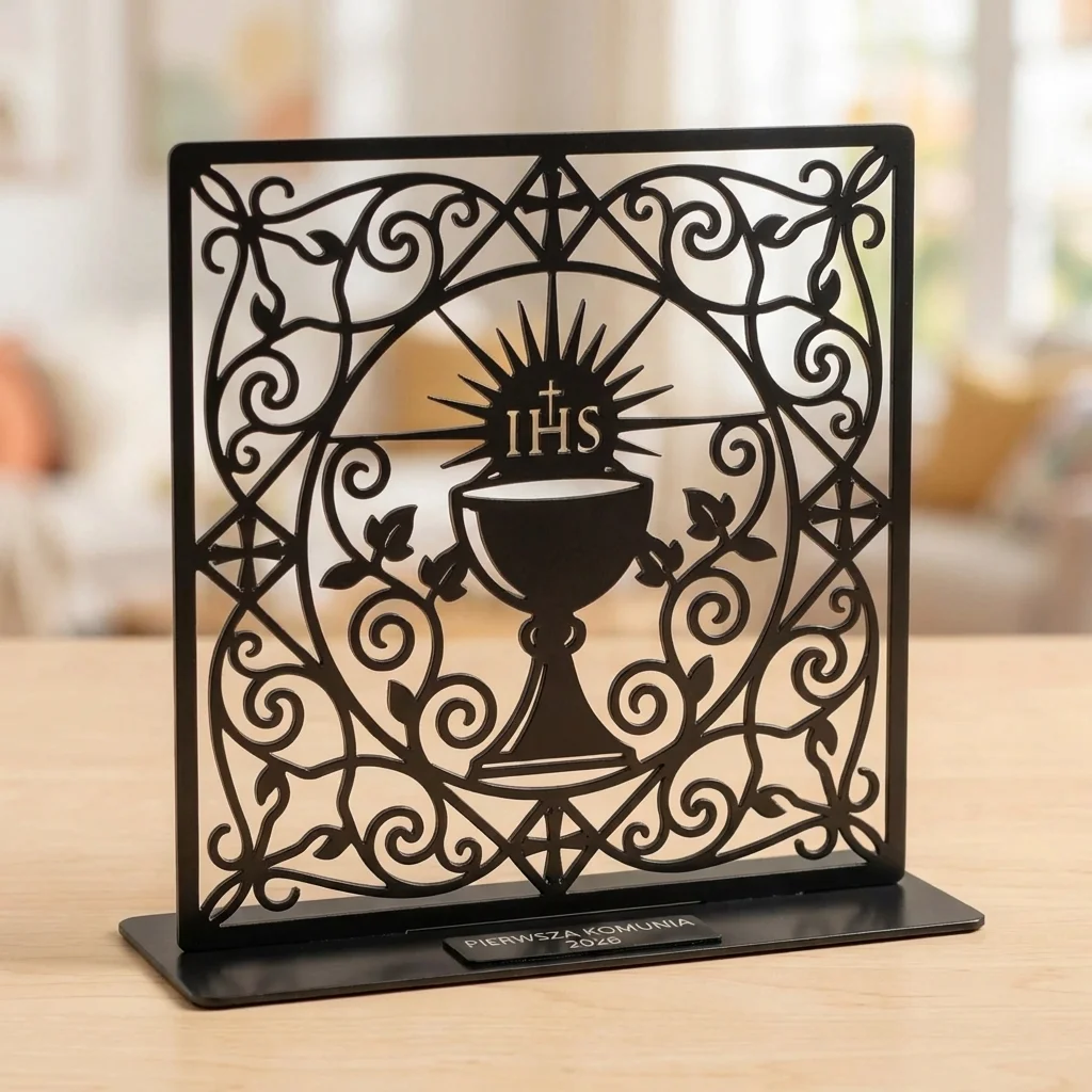 Komunijna Rozeta IHS to elegancka metalowa dekoracja wolnostojąca o wyraźnie religijnym i uroczystym charakterze. Centralny motyw kielicha z symbolem IHS, otoczony ozdobną rozetą, nawiązuje do Eucharystii oraz wyjątkowego momentu Pierwszej Komunii Świętej. To dekoracja, która pięknie prezentuje się jako pamiątka, ozdoba wnętrza lub subtelny akcent w domowej przestrzeni modlitwy.