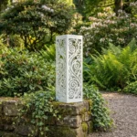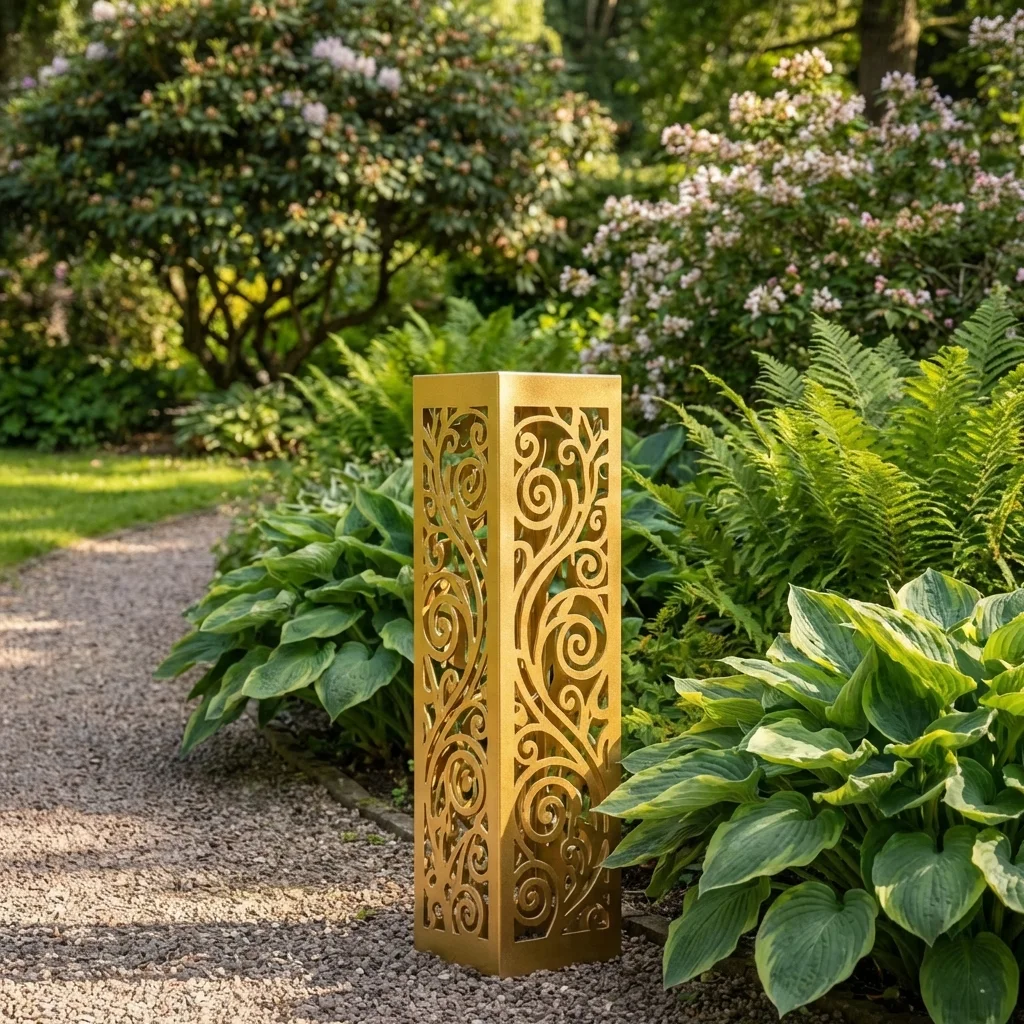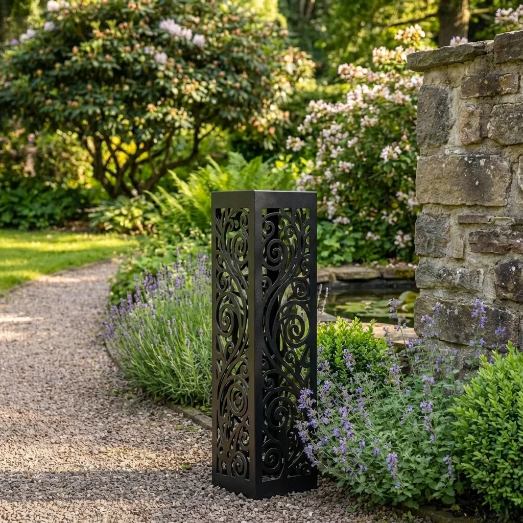 „Królewski Ornament” to wysoka, metalowa kolumna ogrodowa z eleganckim, ażurowym motywem ornamentalnym. Świetnie sprawdza się jako postument pod donicę, element reprezentacyjny przy wejściu lub dekoracyjny akcent w nowoczesnym i klasycznym ogrodzie. Wzór pięknie pracuje ze światłem i cieniem, dzięki czemu kolumna wygląda efektownie z każdej strony.