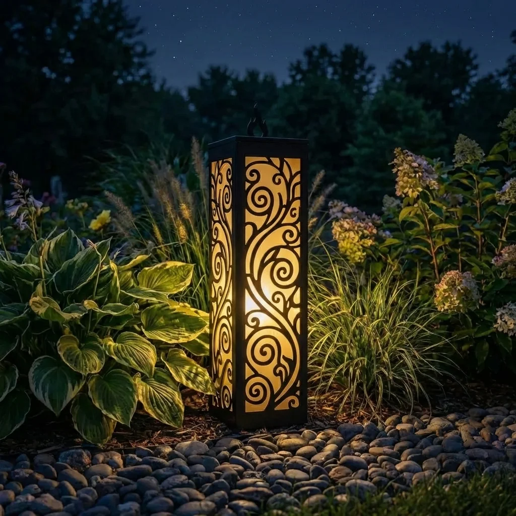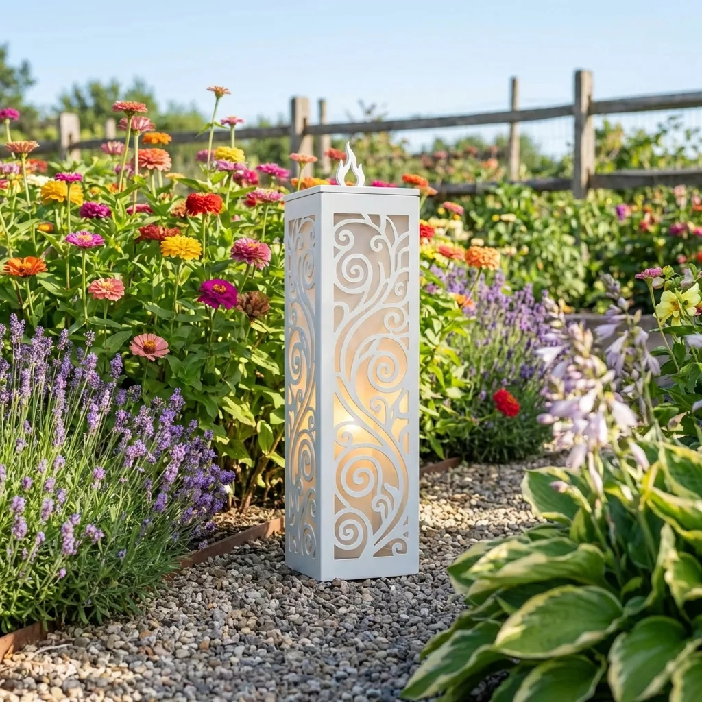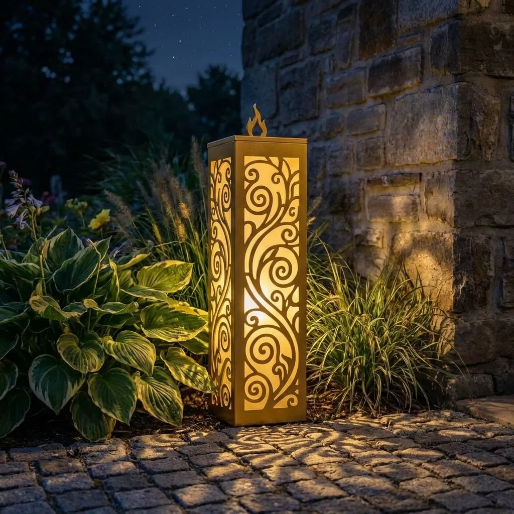 Królewski Ornament to ekskluzywny, metalowy lampion ogrodowy z ażurowym wzorem, który po zmroku tworzy spektakularną grę światła i cienia. Jego elegancka, smukła forma doskonale podkreśla wejścia do domu, tarasy, ścieżki ogrodowe oraz nowoczesne aranżacje stref wypoczynkowych.