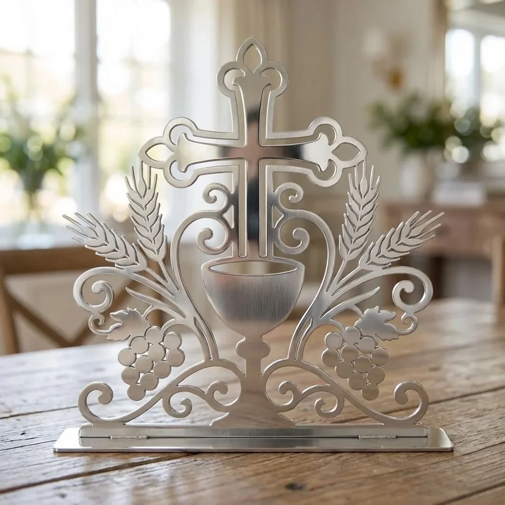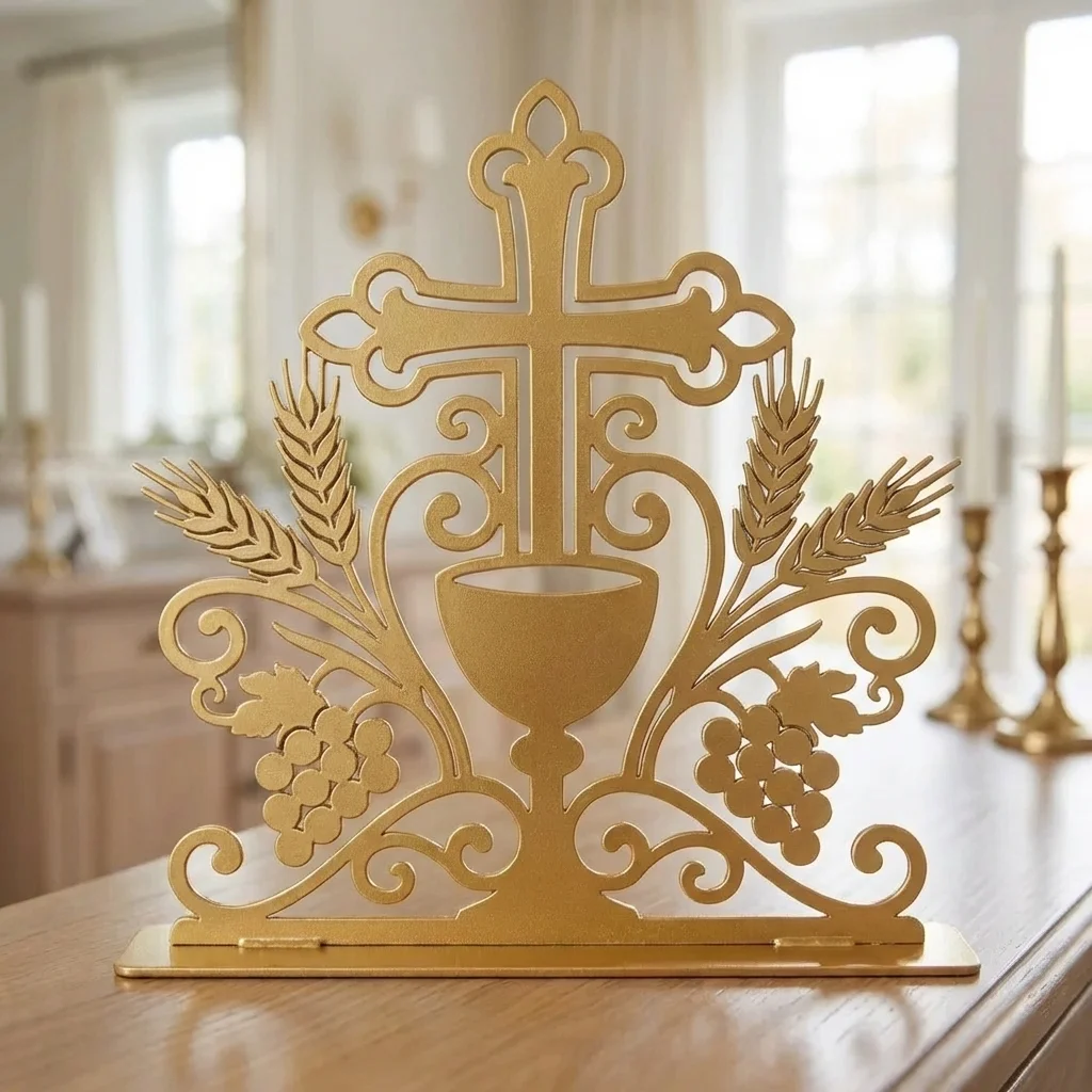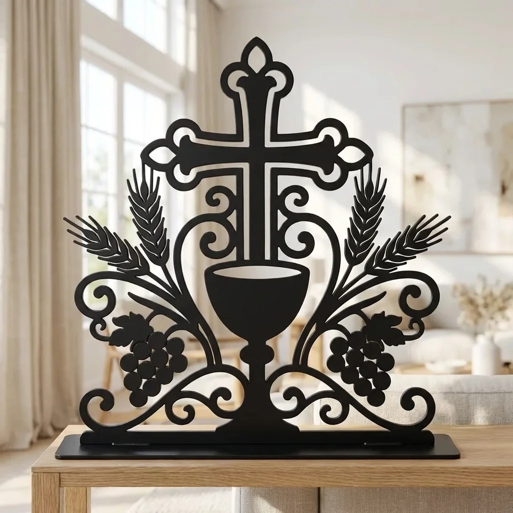 Krzyż Eucharystyczny to metalowa dekoracja wolnostojąca o wyjątkowo symbolicznym i eleganckim charakterze. Motyw krzyża, kielicha, kłosów oraz winogron nawiązuje bezpośrednio do Eucharystii i chrześcijańskiej symboliki, dzięki czemu ozdoba doskonale odnajduje się zarówno w domowych wnętrzach, jak i w przestrzeniach modlitwy. To dekoracja religijna, która łączy subtelną formę z głębokim przekazem.