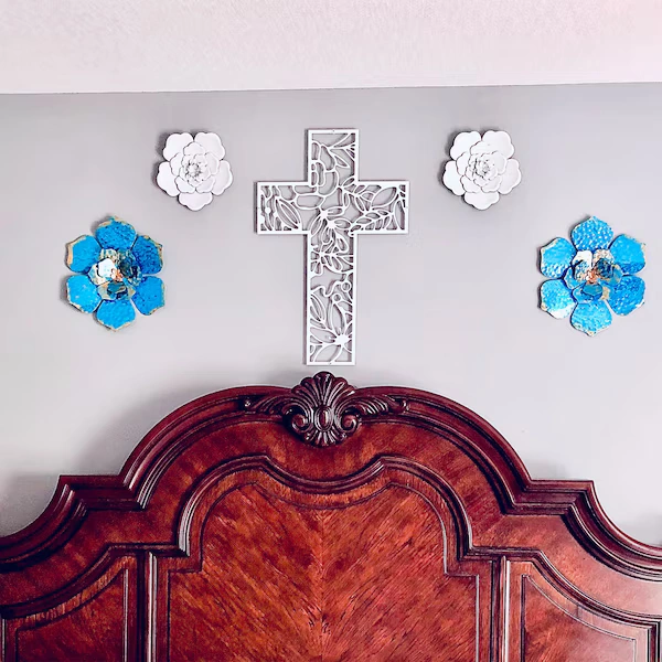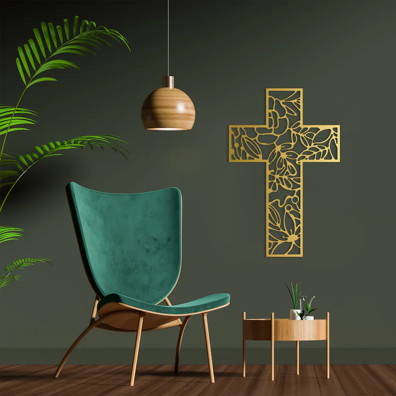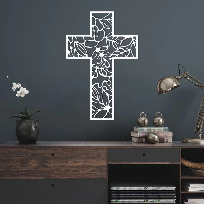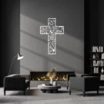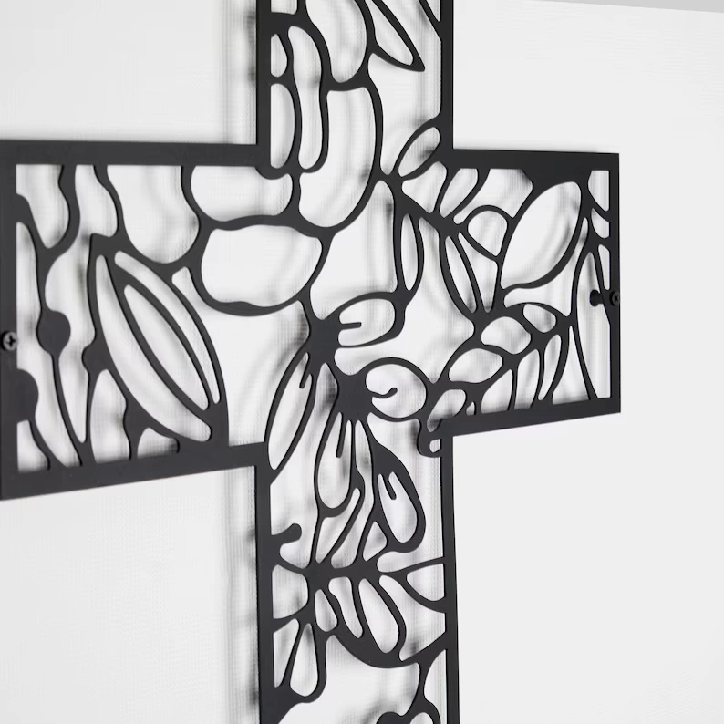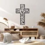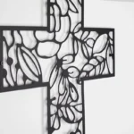 Krzyż metalowy na ścianę w ażurowej, dekoracyjnej formie to elegancka ozdoba z metalu, która subtelnie łączy symbolikę z nowoczesnym designem. Idealny do salonu, sypialni lub domowej kapliczki.