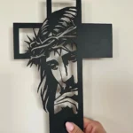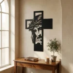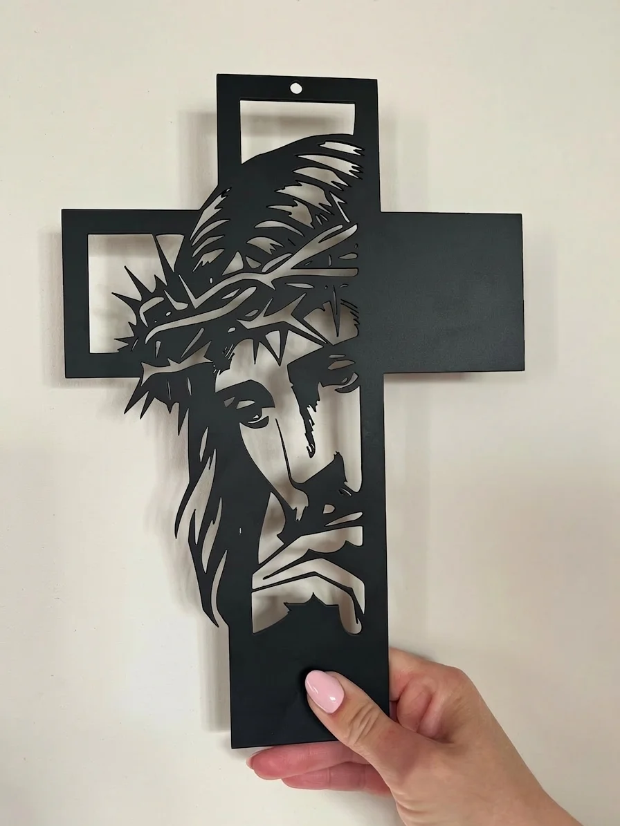 Krzyż metalowy na ścianę z ażurowym wizerunkiem Chrystusa w zadumie. Symboliczna, minimalistyczna dekoracja wykonana z trwałej stali, łącząca klasyczną formę krzyża z nowoczesnym detalem. Idealny do salonu, sypialni lub domowej kapliczki. Darmowa wysyłka na terenie Polski.