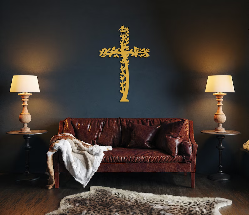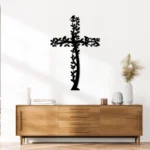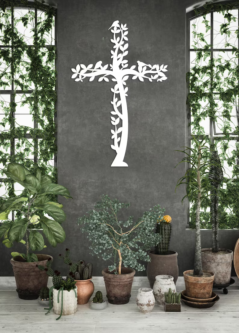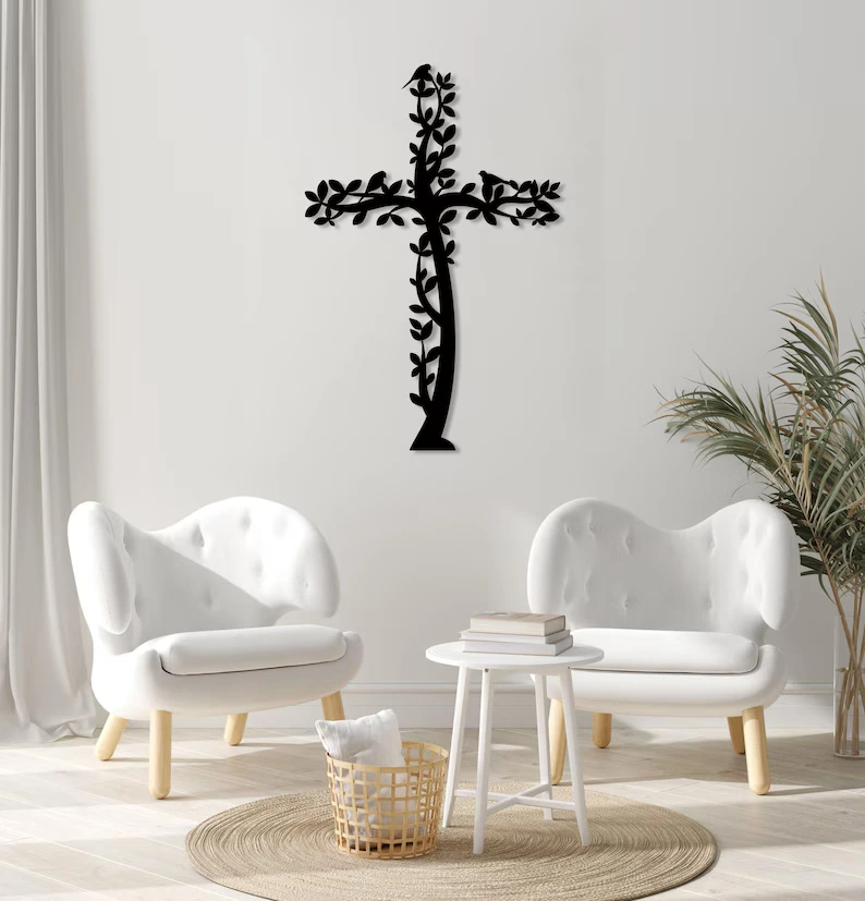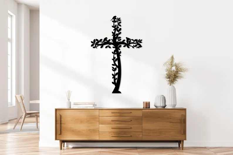 Ten krzyż metalowy na ścianę inspirowany motywem Drzewa Życia i ptaków to wyjątkowe połączenie symboliki chrześcijańskiej z naturą.