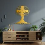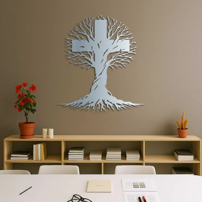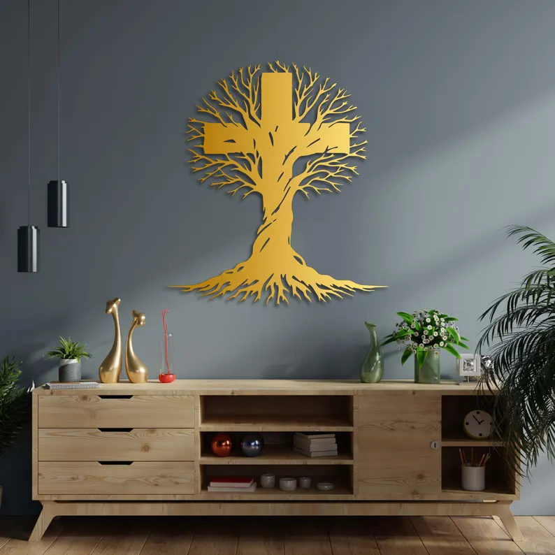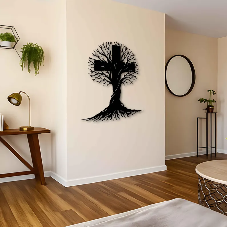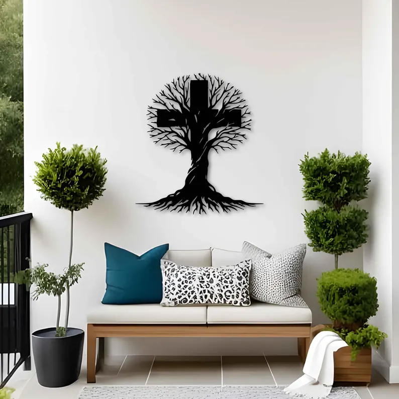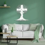 Krzyż metalowy na ścianę z motywem Drzewa Życia. Nowoczesna dekoracja ścienna wykonana z trwałej stali, łącząca symbolikę krzyża z organiczną formą drzewa. Idealny do salonu, sypialni lub strefy wyciszenia. Darmowa wysyłka na terenie Polski.