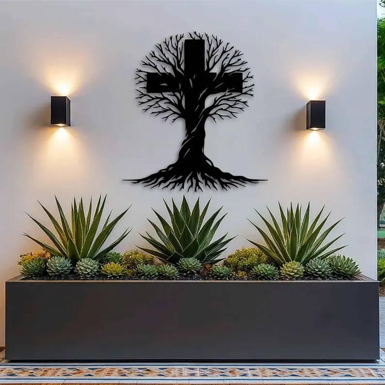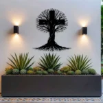 Krzyż metalowy na ścianę z motywem Drzewa Życia to wyjątkowa dekoracja łącząca symbolikę krzyża z organiczną formą rozrastających się gałęzi i korzeni. Całość tworzy harmonijną kompozycję, która wprowadza do wnętrza spokój, równowagę i głębszy sens.